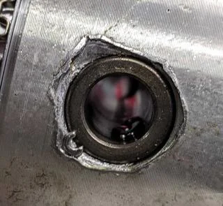 This looks to me like the edge of the piston failed. I have not checked the end play on the crankshaft. I bought Hepolite pistons this time