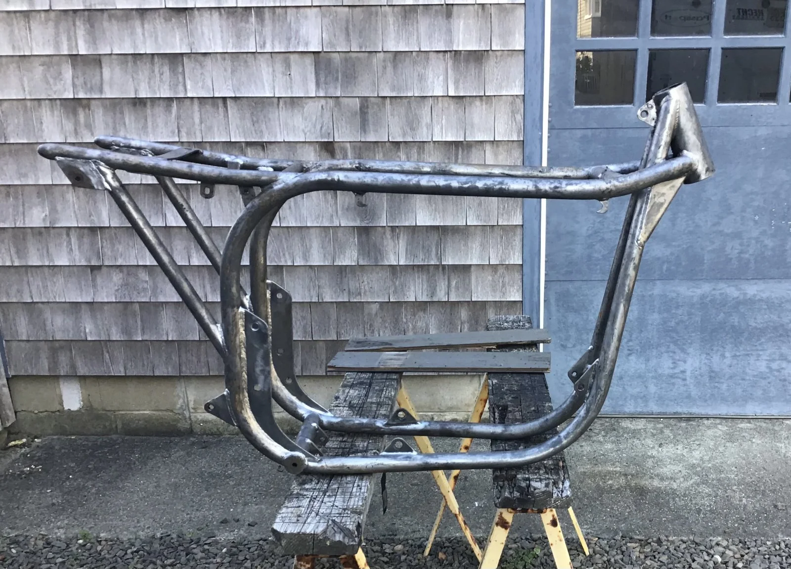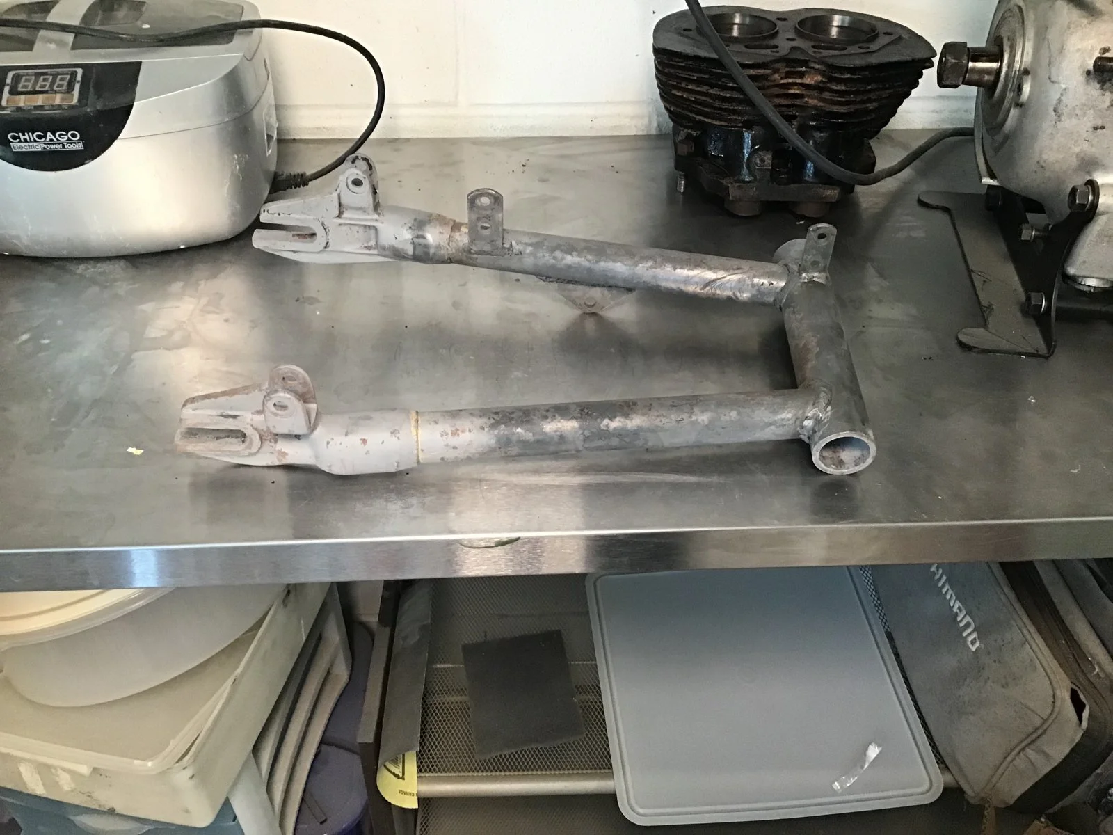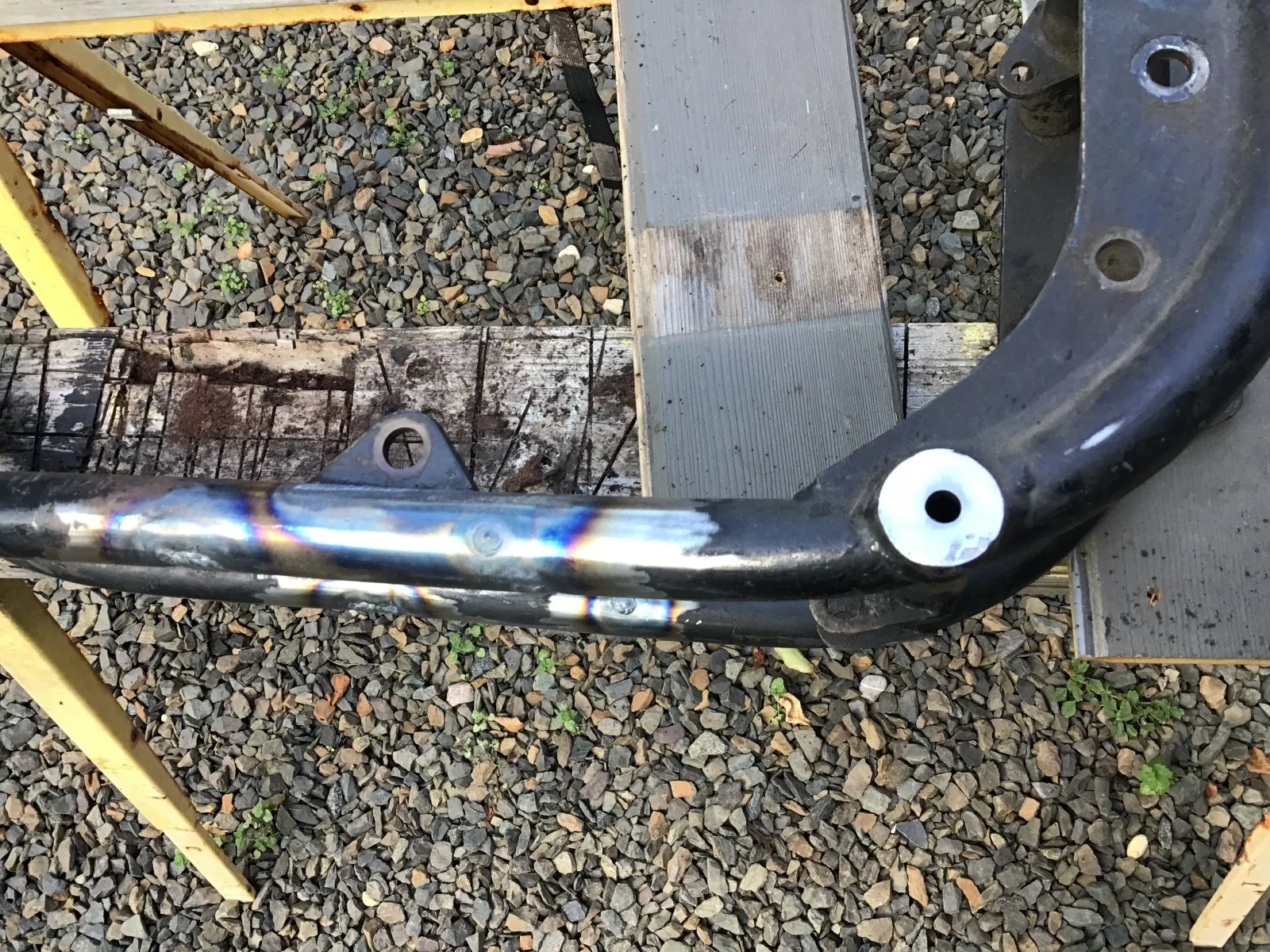 expected thanks to having a socket with O.D. slightly smaller than I.D. of cross tube and access to arbor press . Welds dressed by hand with files and frame and swingarm paint stripped.