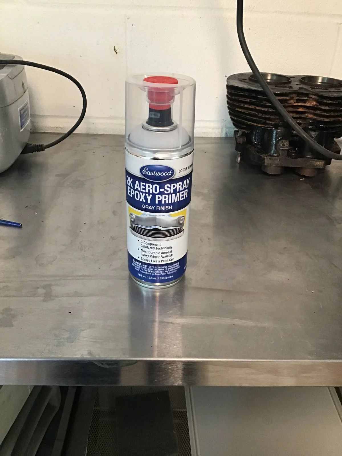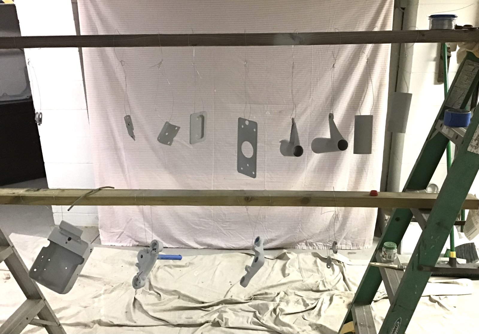 Some more bits in primer - I am pretty impressed with this 2 part epoxy in rattle can from Eastwood. Sprays beautifully - self leveling to a degree . What you see hanging here took one 12.5 oz can exactly.