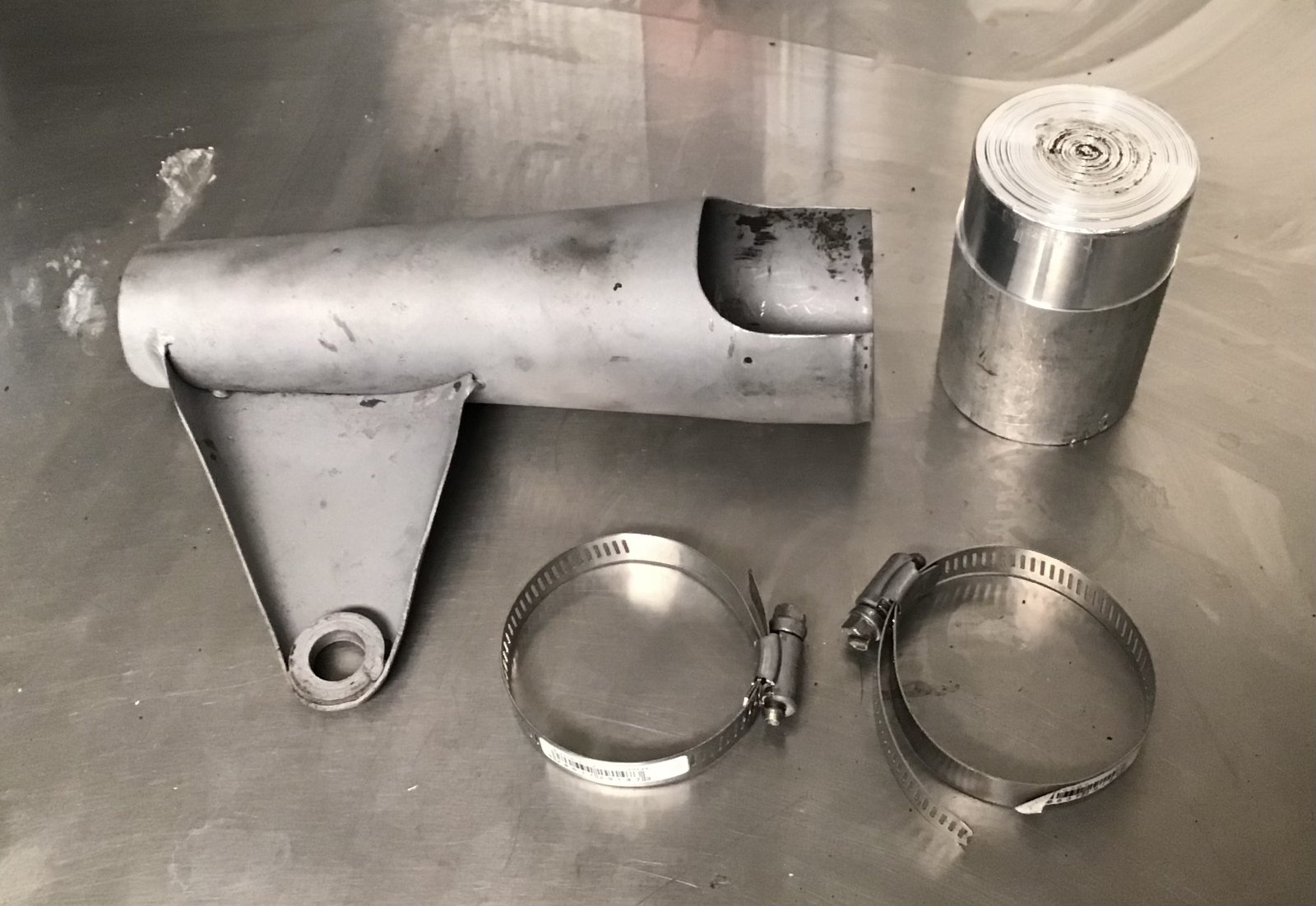 One headlamp ear was in pretty bad shape but found another on E bay . They and the lower covers that join them had some dents and ovality. I turned a piece of aluminum to the appropriate diameter and was able to return them to round by using hose clamps around the aluminum turning.