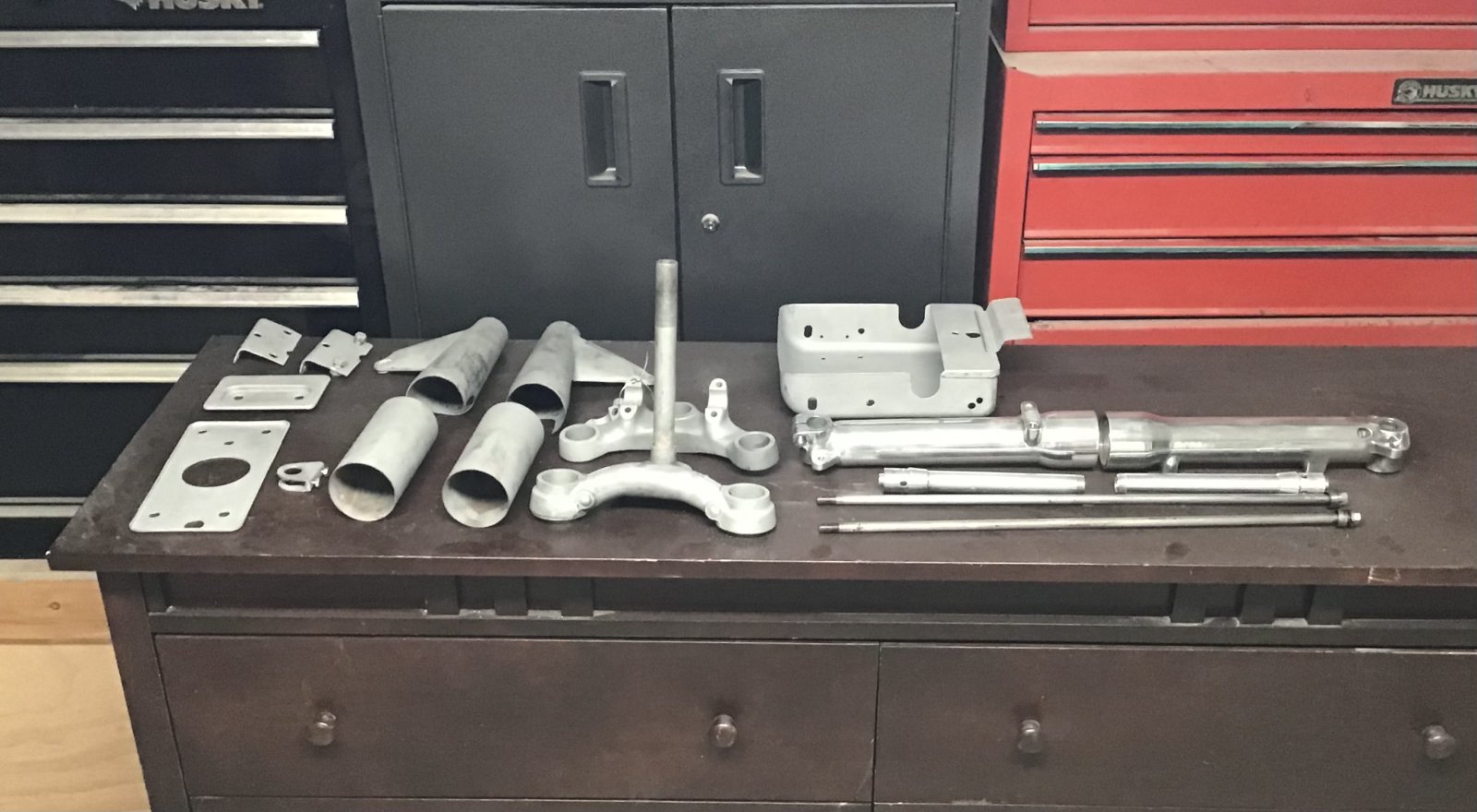The fender ( mudguard) , front engine plates and rear grab rails going to plater to have the chrome removed by reverse plating then media blasting and primer , then dent removal, straightening, etc .