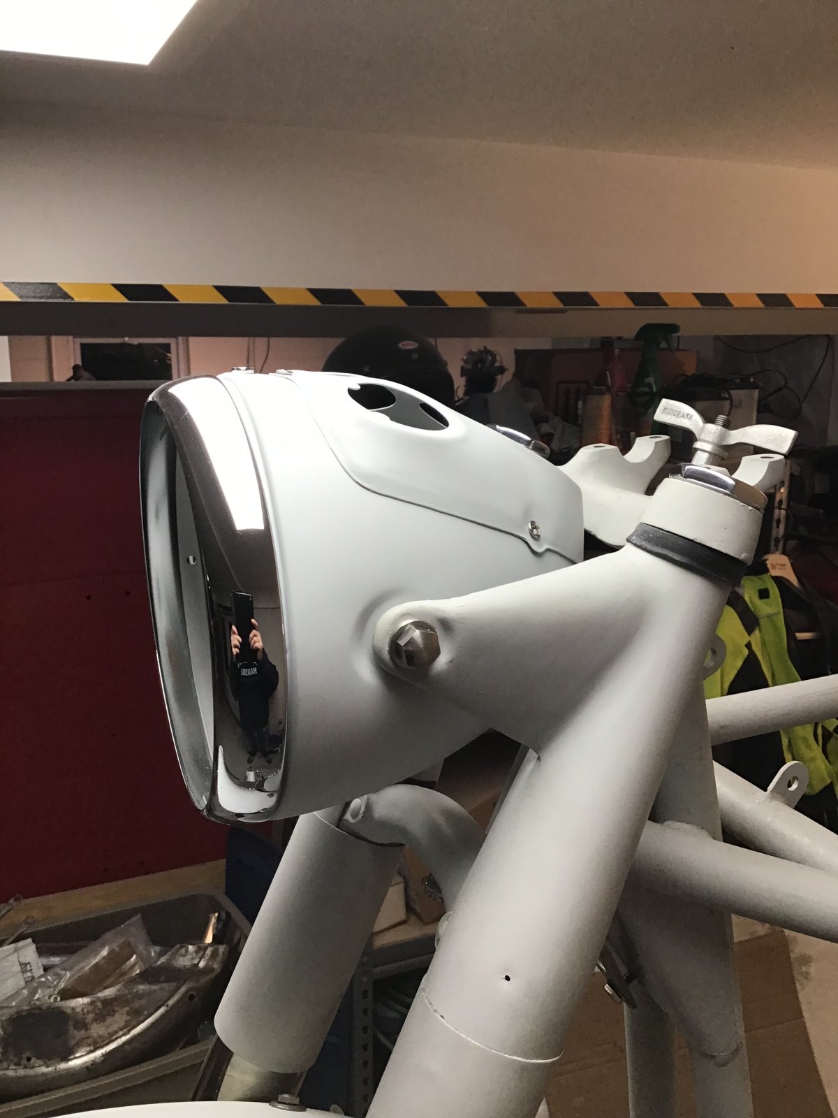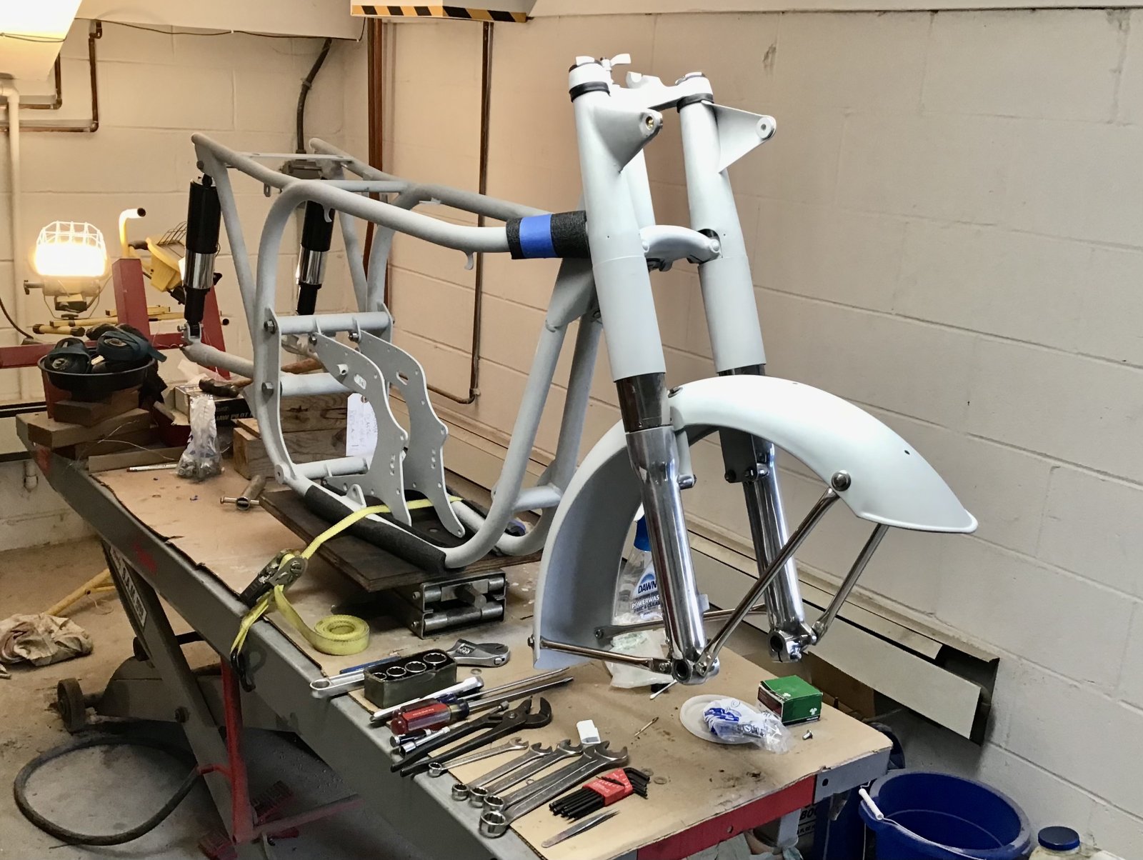 Forks back together. Front fender ( mudguard) dry fitted . Needs a little tweaking. Lower stay mount ears on sliders pretty well butchered in thread department by previous owner - I will likely through bolt the stays rather than try thread repair.