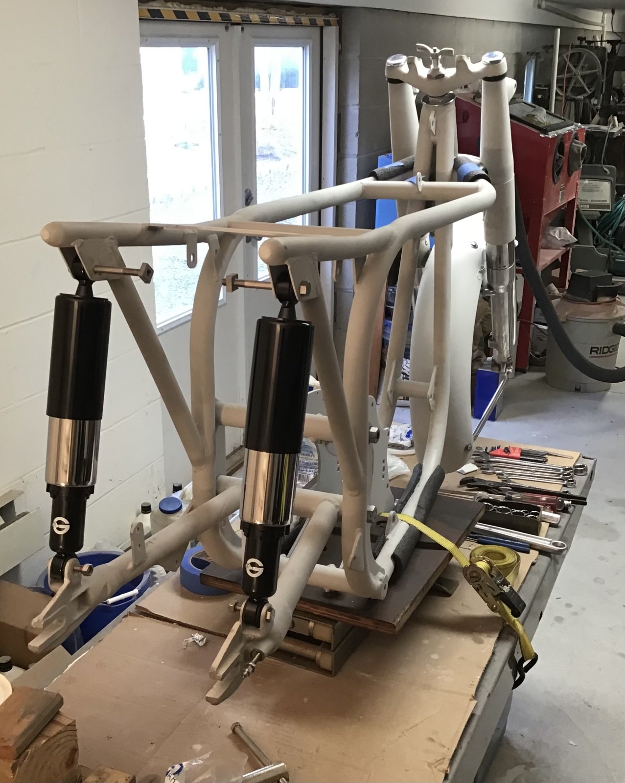 I have new silent block bushes but I will install them closer to final assembly. I have the original Armstrong rear shocks but doubtful of their integrity and rebuilding them seems questionable so I purchased new Girling shrouded classic units . These come with universal bushing kits . The bushes all needed facing on the lathe in order to fit the frame and swingarm mounts .