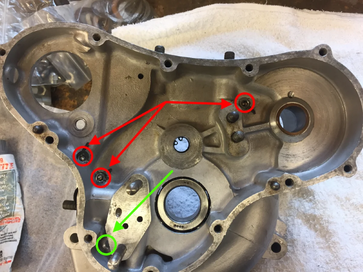I treat the pre-commando engine exactly the same way as the Commando one, and block up the holes between timing side and crankside (circled in red).