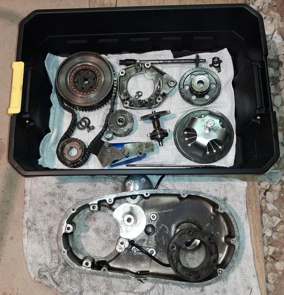 Finally got the primary apart. When the engine sprocket finally came off it came off with a BANG! Scared the crap out of me. I didn't know what happened at first, I thought I broke something. Haha. Engine pulled, cleaned up and on the stand. A good days work, I'm happy.