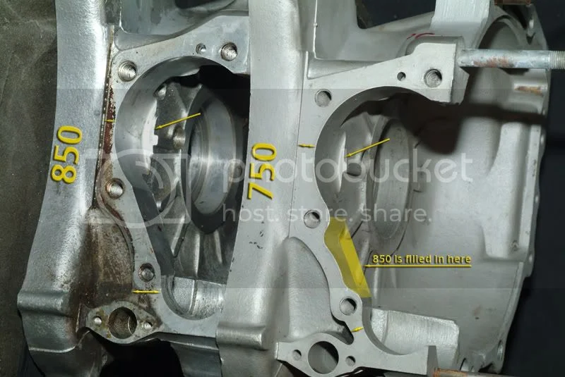 I have fairly late model 750 cases which I thought should be as beefy as the 850 cases and what I've heard would be suitable to widen out for fitting 850 barrels. However comparing them side by side to actual 850 cases from a Mark 2a 1974 engine they don't seem as thick in several places. Not shown in the photos is the gussets along the mating surface along the back. The 750 gussets join the main thickness of the case pretty well at right angles whereas the 850 cases have a thick gradual curve where the gusset joins the main thickness of the case.