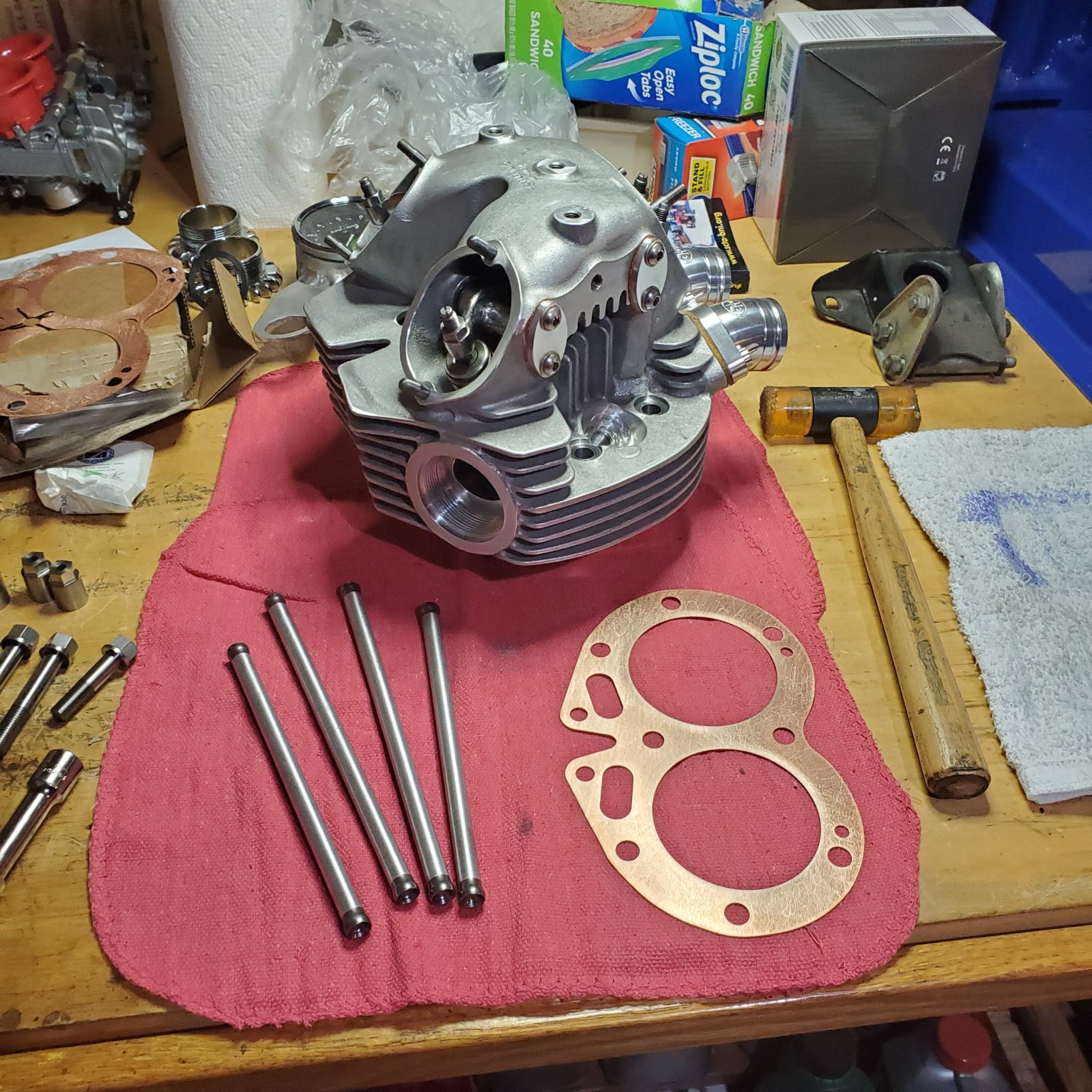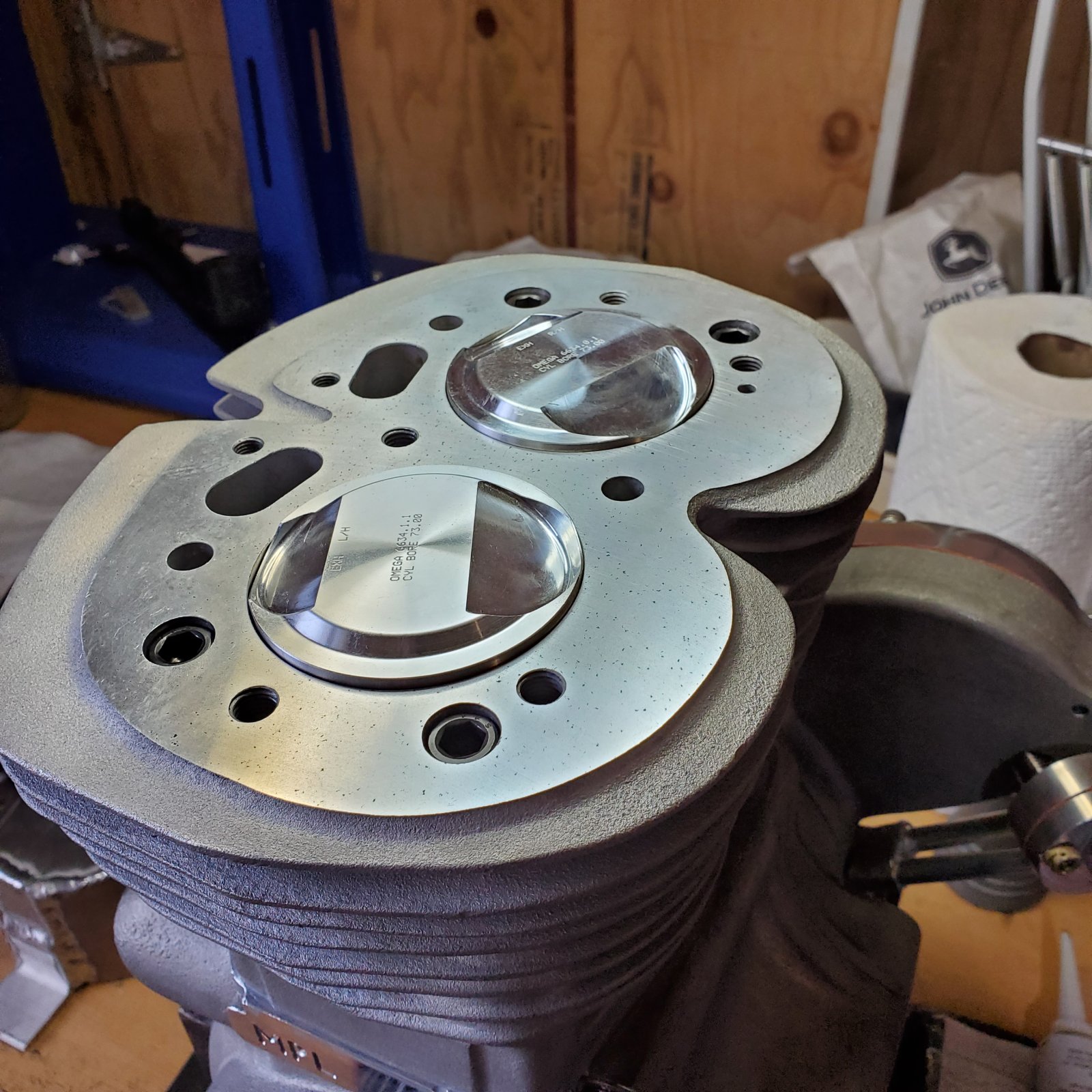 Have fun getting the front two 3/8 stud nuts on fastening the head to the barrels. A couple of strips of 1/4" or 5/16" material slid in the front and back under the fins outside the gasket surface to hold the head up so you can start the nuts might help. Then again those barrels might have a different casting than the Molnar barrels I have and will be easy to fasten.