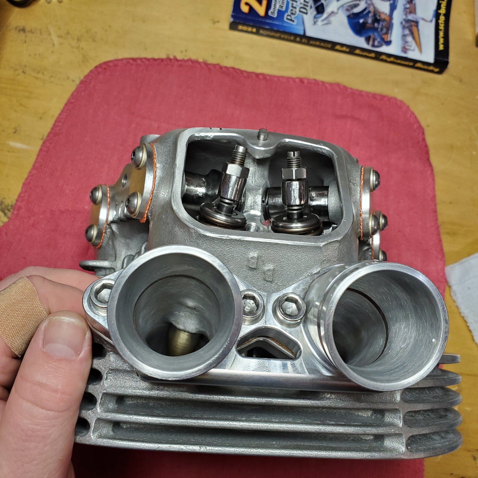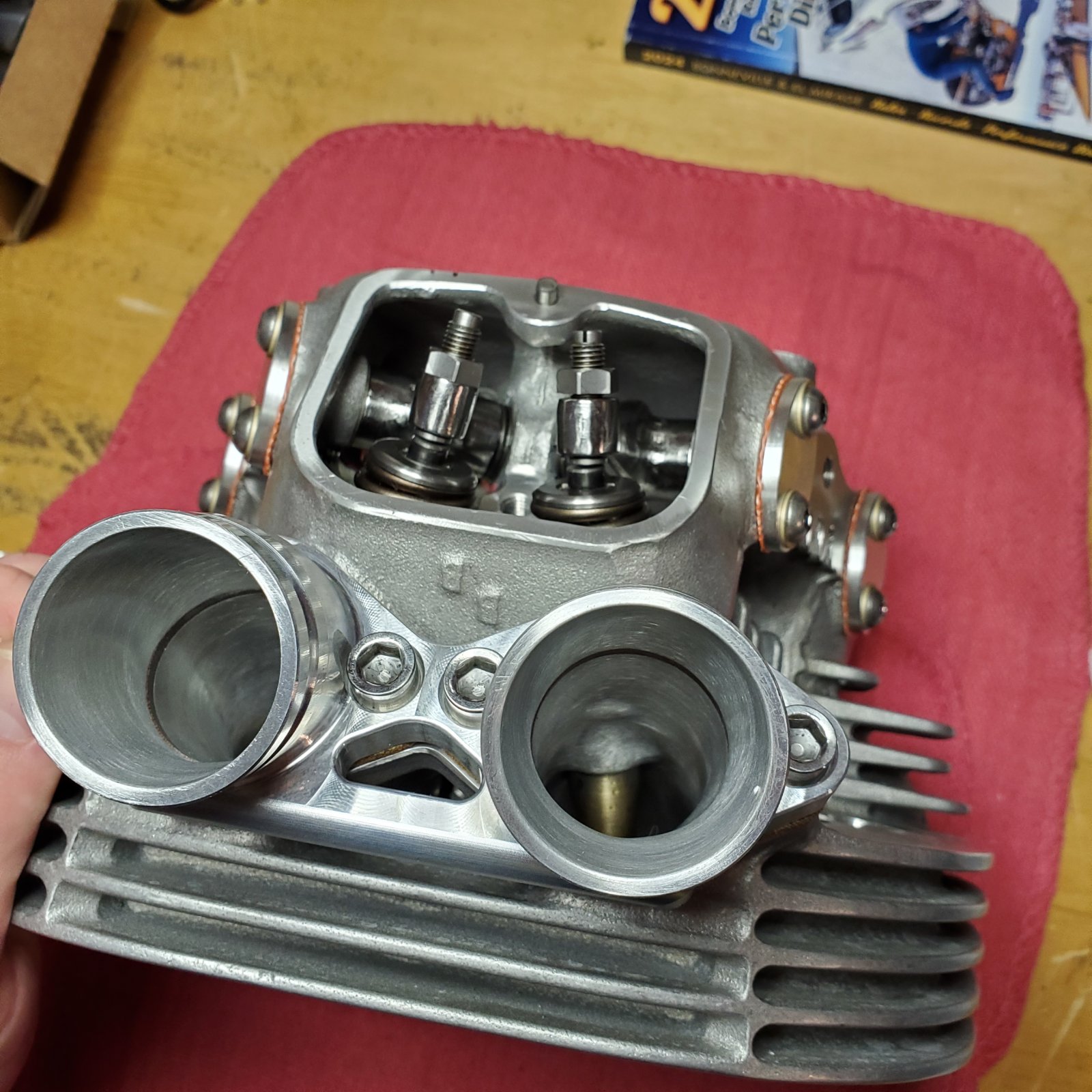 And before I get any further in this, I know there have been questions about ports on this head so here are a few shots of the intake and exhaust. Unfortunately I don't have the numbers in front of me for the port sizes but I will get those tomorrow when I go to the shop. However, I can say that after the port/polish and flow work Leo Goff has said "the head will flow enough for 90-95HP". Sadly no actual CFM numbers for those interested.