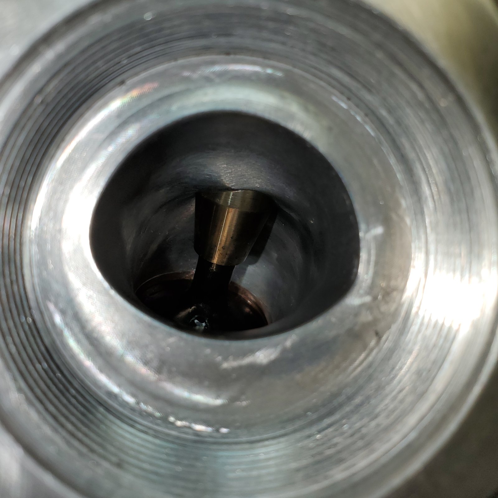 After about 5-6 attempts to start accompanied by checking, re-checking, and adjusting everything we could think of, decided to roll it back on the lift and dig into it in the comfort of air conditioning. Cam timing, ignition timing, valve clearance, ect. All the items on my list came up good. Until I looked into the cylinders..... Scoring of the nikasil lining from piston rings. Its hard to tell how bad it is in the photo but the bore gauge showed that it was at minimum .002" deep in just the few times we tried to get it running.
