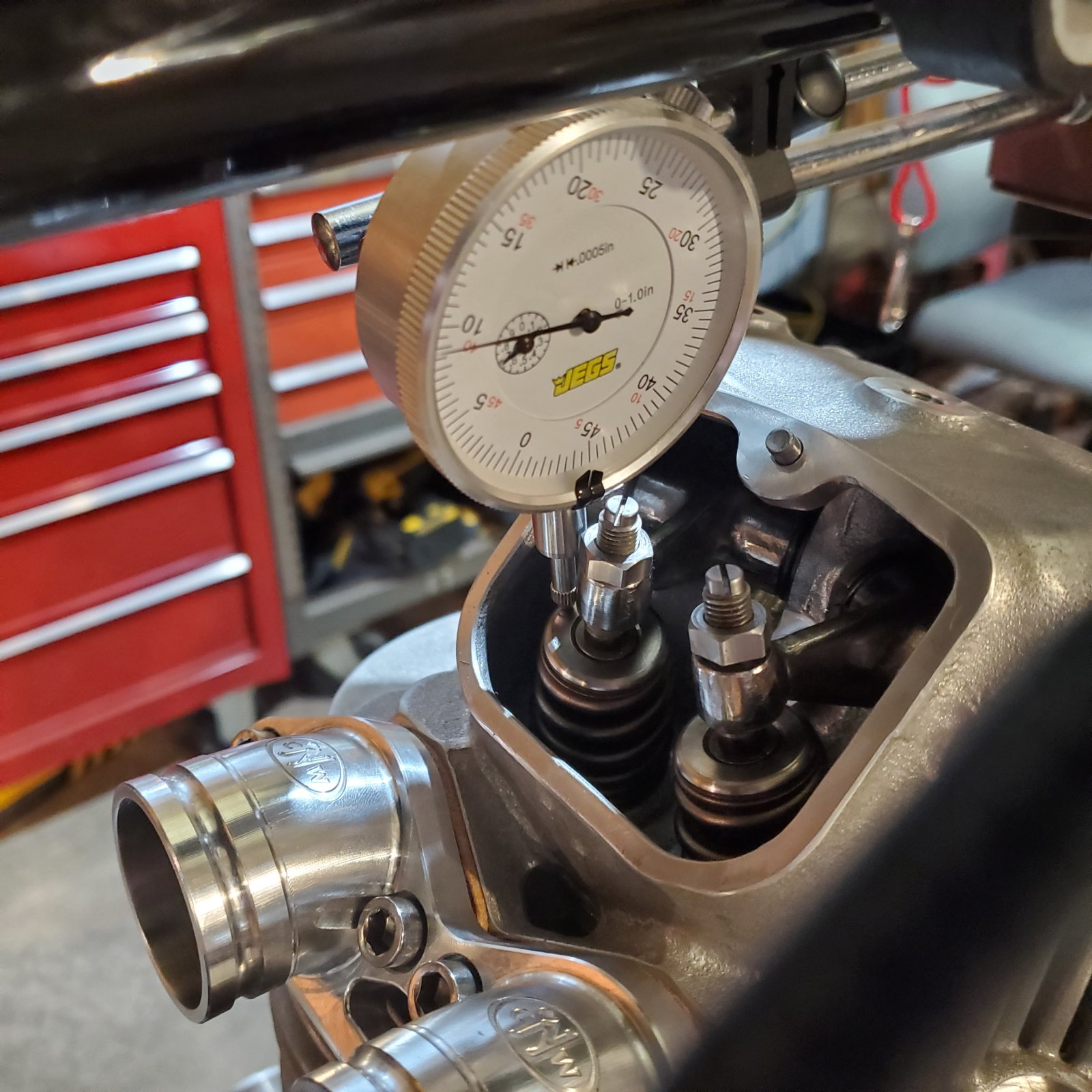 Alright everyone. Did everything I could with the time I had this weekend. Sadly I didn't get pictures of all the steps but hit some of the highlights. As previously shown, got the head back to the house late Friday evening, and first thing Saturday morning I set into getting pushrod length set for proper rocker arm geometry (long story short, rocker arm adjuster stem being parallel/colinear with the valve stem and approx. 90 to the rocker arm axis at half gross lift). Luckily after tedious checking and rechecking, the pushrods provided in the JS4 cam kit measured out perfectly without modification.