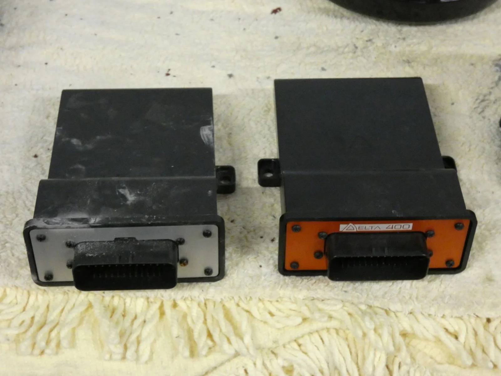 Old and new ECU. the rear (left in shot) lug needs to be removed to fit into the seat space. The factory one has been removed by someone trained at the Bigger Hammer School of Engineering Finesse, it had been crudely snapped off. I will try to be a bit neater.