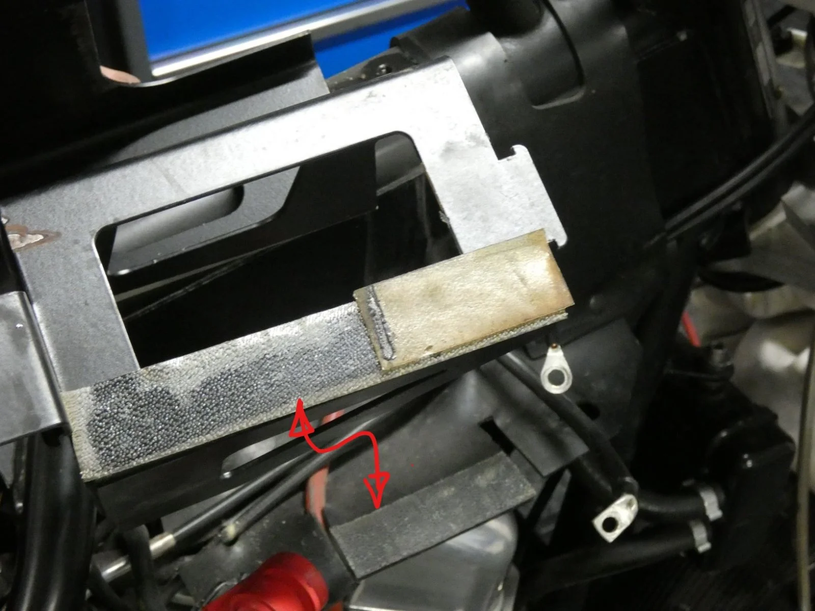 One of the throttle cables is getting worn on the underside of the battery tray, see below and top left in the pic above. My usual fix is to glue a piece of old inner tube on any contact spot.