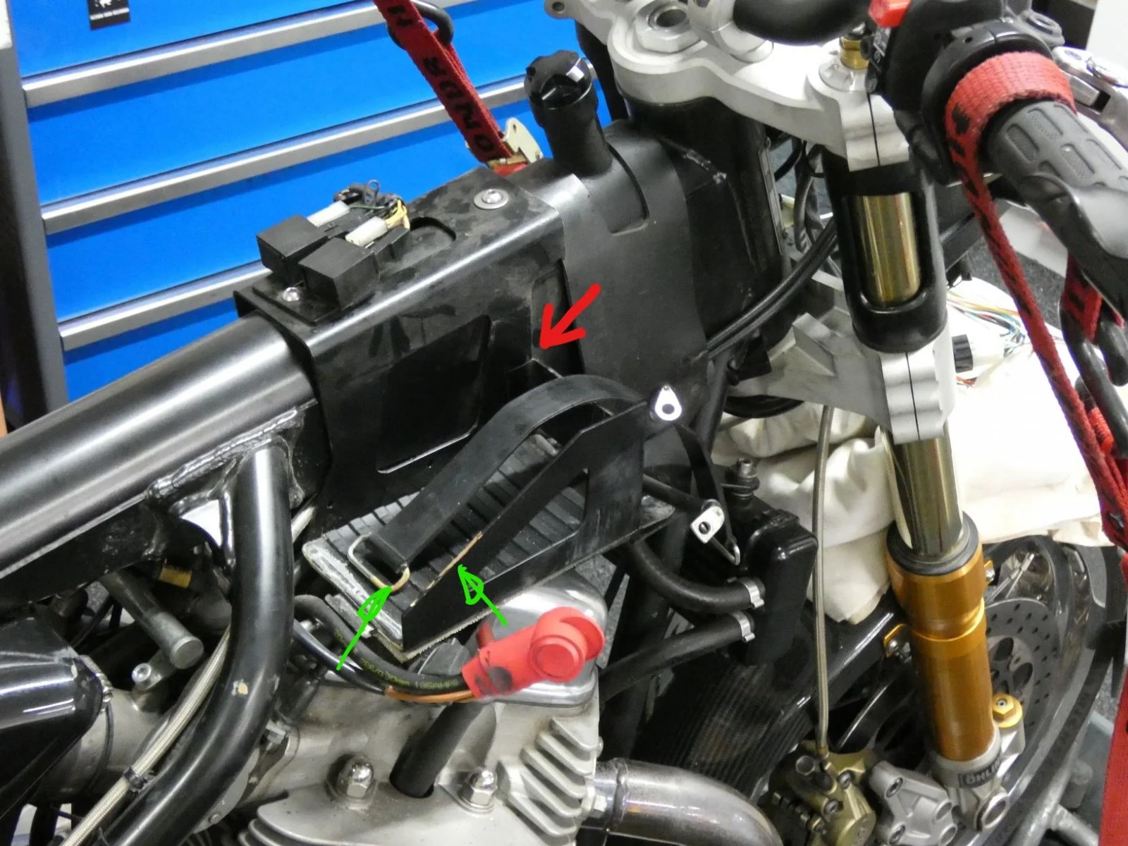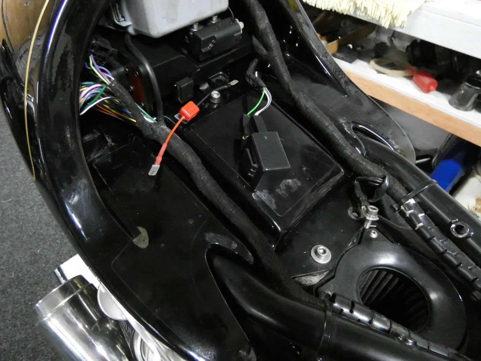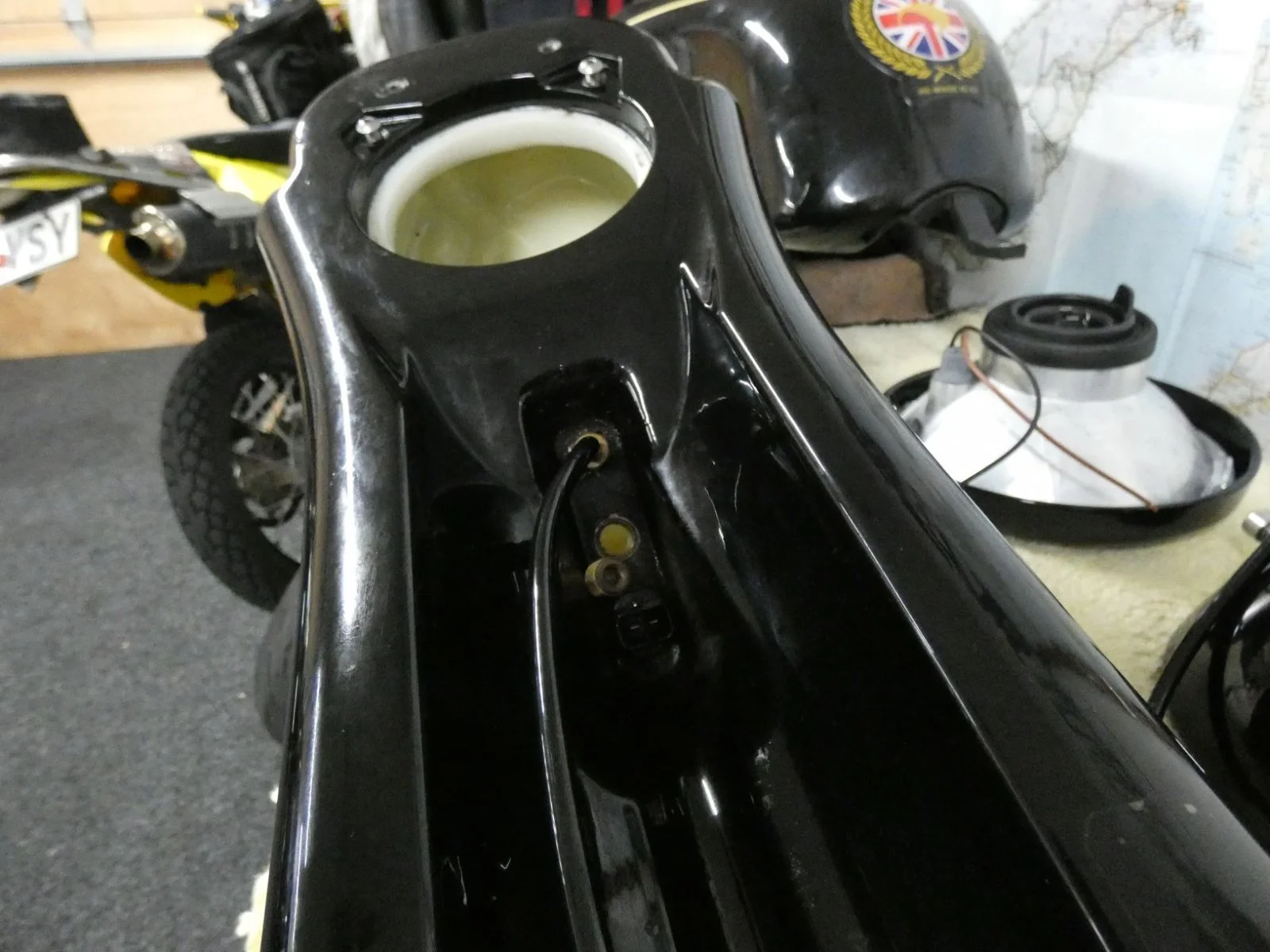 There is a rubber mat over the engine/under the fuel tank - possibly a splash guard due to the short front mudguard? I hadn't noticed until now that there was velcro to hold the mat to the underside of the battery tray. It might have been effective in the show room but that was long ago.
