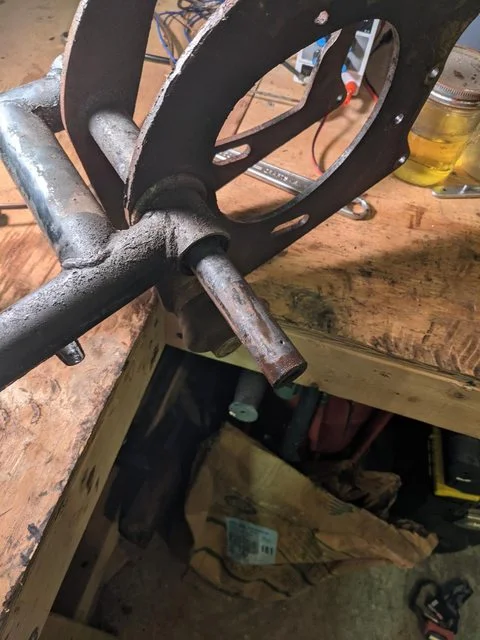 When I put the gearbox on pause, I started to disassemble the rest of the frame. First were the forks. Everything came off pretty smoothly. They did a good job with the 1 5/16" nuts on both the top of the forks and to hold the steering stem. One socket takes care of it all! Getting the top out of the bearings took a little effort, but in the end it all came out, including the bearings themselves.