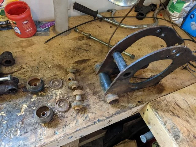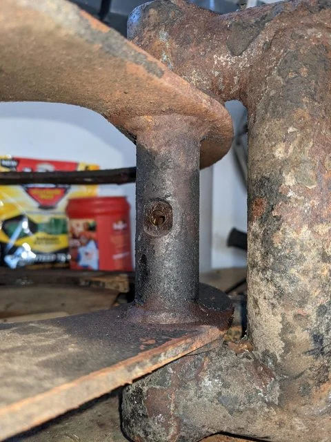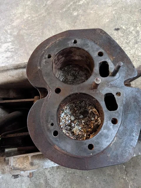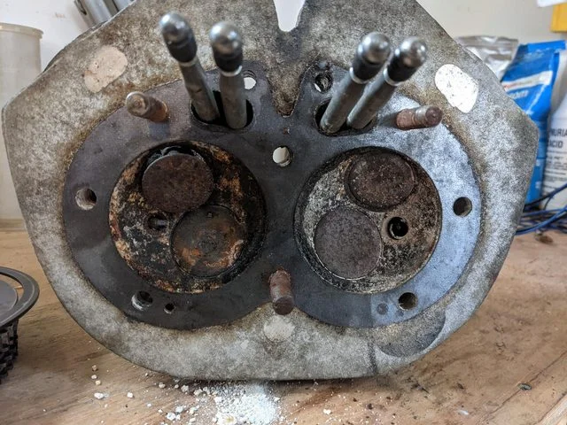 Next came the head. The left hand exhaust was easy to remove and the collar backed out without issue. The threads look good! The right hand was stuck though. I completely destroyed the collar trying to remove it. In the end I simply cut off the holey right hand exhaust pipe. After removing all the fasteners-the only one that broke was the hidden middle one on the top-and a little pounding, the head came off. Overall, I'm pretty pleased with its condition. I just need to extract the broken remnants of the exhaust collar. New valves, guides, springs, and maybe new exhaust threads and it should be good to go.