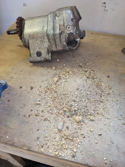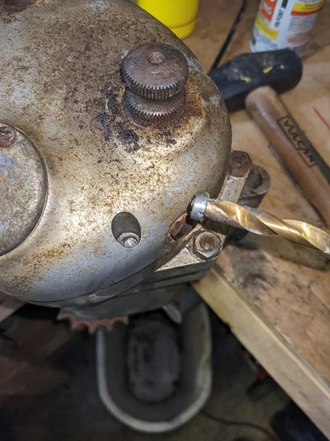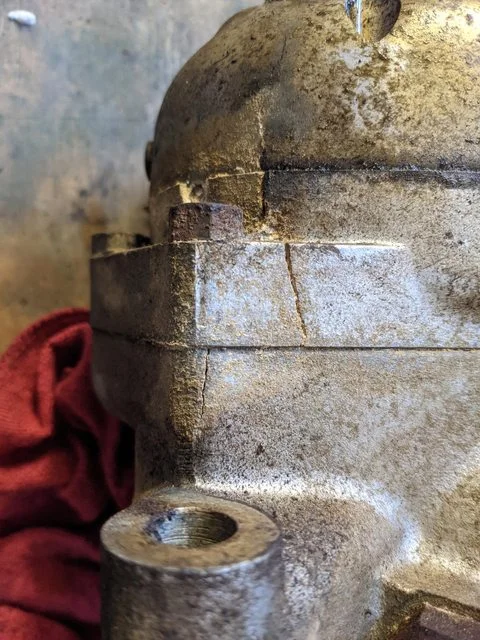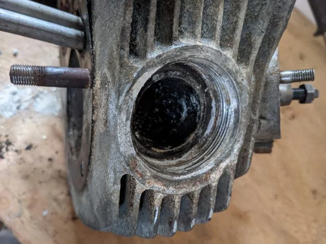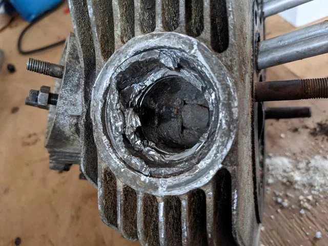 Timing side exhaust port with the remnants of the exhaust collar and tail pipe. I'm hoping to be able to collapse it now that I can get a better angle on it.