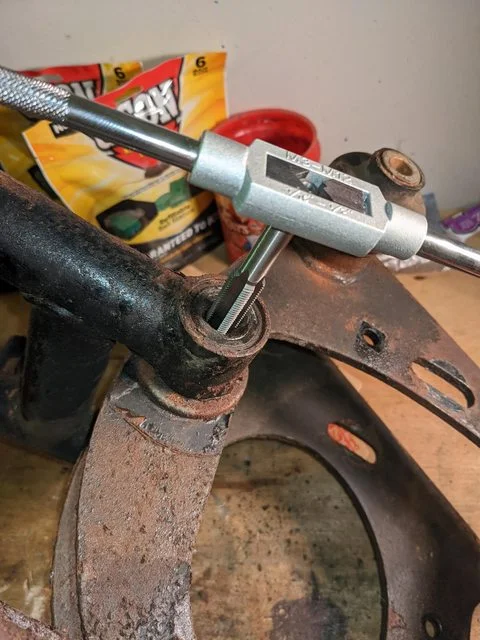 To pick up where I left off, while awaiting the arrival of the special tools. I ground off an Allen wrench to remove the carbs. Boy, what a pain! I spent additional time bead blasting and painting some parts. After a few days the pinion gear extractor, clutch spring compressor, and exhaust nut wrench finally arrived. Now I was able to make some good progress.