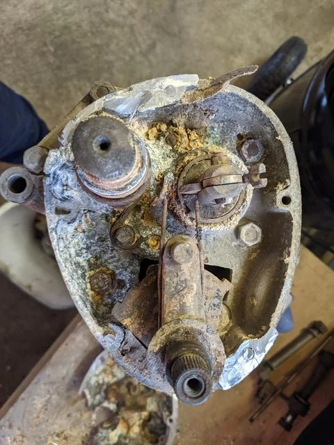 The inside of the cylinder showed a lot of corrosion. I'm sure some of it came from hitting the head. Unfortunately, the cylinder wouldn't budge from the pistons, so my plan was to remove the remaining lower engine, split the cases, remove the connecting rod caps from the crankshaft so I can deal with the connecting rods, pistons, and cylinder separately.