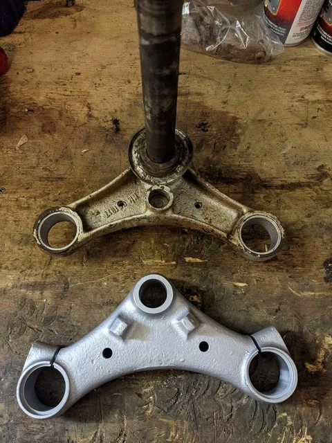 A few days ago I bead blasted the bottom yoke, primed and painted it an aluminum color. It looks fantastic! I'll do the uppers sometime soon.