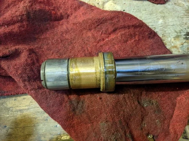 I also began tearing into the forks. The top collar on both lowers came off without any issues. The plating, whatever it was, is in pretty bad shape and they aren't that expensive, so I'll order new. The lower bushings looked fine as did the brass. One side was slightly scored, so I just ordered new ones. I made my first order from Old Britts. Hopefully it will be in shortly.