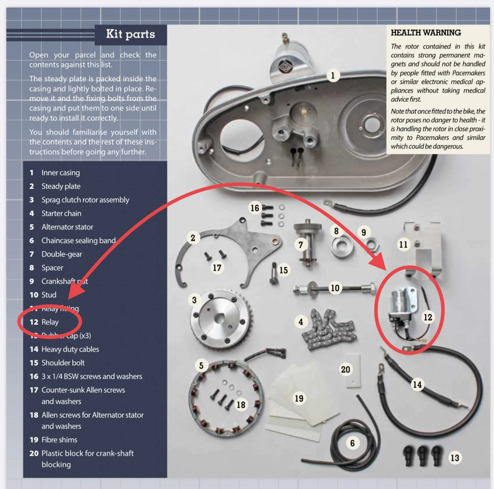 The role of the relay that is included in the Alton kit is to take a low current through the handlebar switch and use to energise a very small electromagnet that will move the contacts that carry the high current to the starter motor.