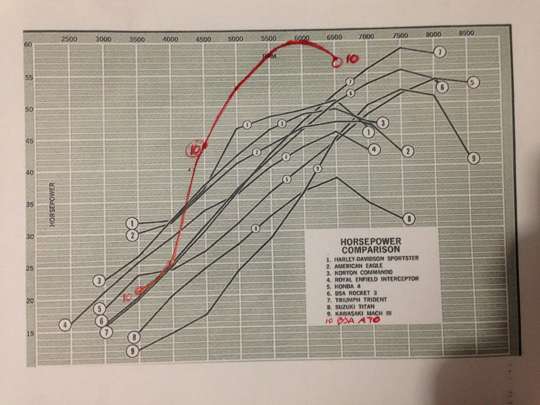 In 1970 BSA were testing what would be the works 750 3 I expect against the power graph of an A65 twin with A10 crank and almost matching it. The twin had 78hp @ 7,000 at the crank. They were revving the 3 to 9,500 and still shy. And even a hot 650 A65 was beating it to 5,500rpm. The biking world would have been different if only the 3 cylinders were based on the A65. Thunderbolts have 27mm ports like the triple except they flow 108cfm each. If they used the Spitfire cam, same bore, short stroke for a 750cc, pushrods inside, with the oil, the motorcycling world would have been a different place. On the mildest hp calculator that flow would enable 77hp.