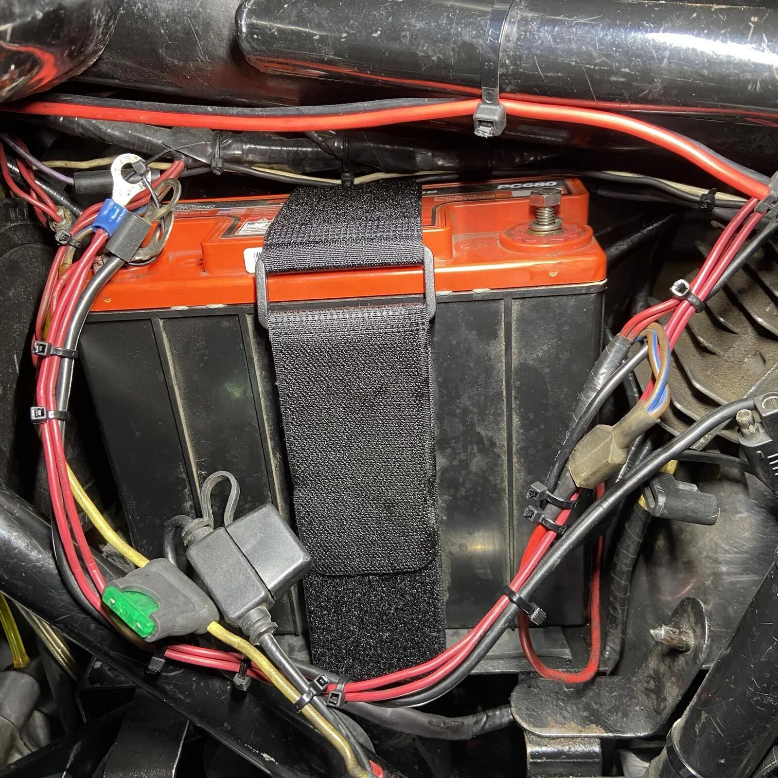 Back in the day I would sell the stock angle bar with two stainless steel spokes in a kit, now a piece of industrial strength Velcro does a better job, cleaner installation and really secure.Show me your favorite and cleverest non-standard battery hold down.