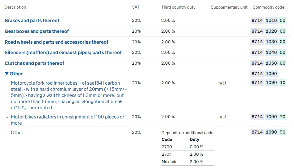In the US, there is no duty on 8714-10-0050 or 8714-10-0090 either of which are applicable to the kit but those aren't valid in the UK. You might check if you can use 8714-10-9090 as the e-start is not a "gearbox or part thereof" or any of the other specific things listed. Not an expert, just fight with it a lot.