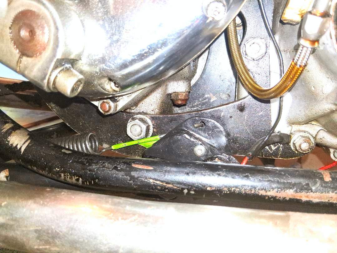 I fixed the problem by raising the spring hole up about 1". I made a doubling plate which bolts to the original plate through the original spring hole with a shouldered bolt so only 3/16" of the bolt actually sticks out of the hole to keep from interfering with the arm of the spring. The doubling plate is welded to an offset plate that realigned the extension plate with the original plate so the hole is still in the same plane as the original hole. As you can see the arm of the spring just barely touches the underside of the bottom gearbox bolt, but the angle has been increased enough to keep the centerstand from bouncing. I still have some music wire coming this week that is heavier than the standard spring wire, but I've already tested the stock spring raised 1" above horizontal and it works fine. I rode my test loop and it didn't bounce at all much less bounce down and hit the pavement... I still may make the heavier spring. I'm also going to zip tie a piece of rubber where the stand hits the frame because it returns to the up position with a vengeance now...