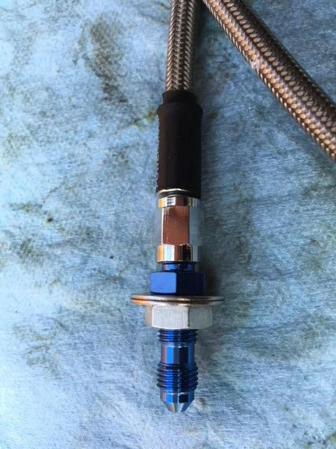 The bad news: there does not seem to be such a thing as a straight bulkhead fitting adapter with 37° AN3 male one end and SAE 45° male at the other. Best we cd come up with at the hose supply place was a 2 pc affair, going AN3 to 1/8 npt female, then male brass 1/8 npt to SAE 45 end to match the double 45° flare. Even then it was not a bulkhead fitting, so no good way to attach to the bracket.