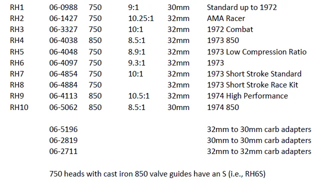Ok, I'm confused. What was the displacement of the engines with RH7 and RH8 heads? Were they standard 750 or 850 cylinders? Were the cylinders shorter? Where the head chambers 750 or 850, or something else? Were the crankcases 750-type or 850-type (cylinder through bolts)?Short strokes were 850 engines with a shorter stroke crank (different rods etc.) so the RH7 and RH8 heads should be 850 type.