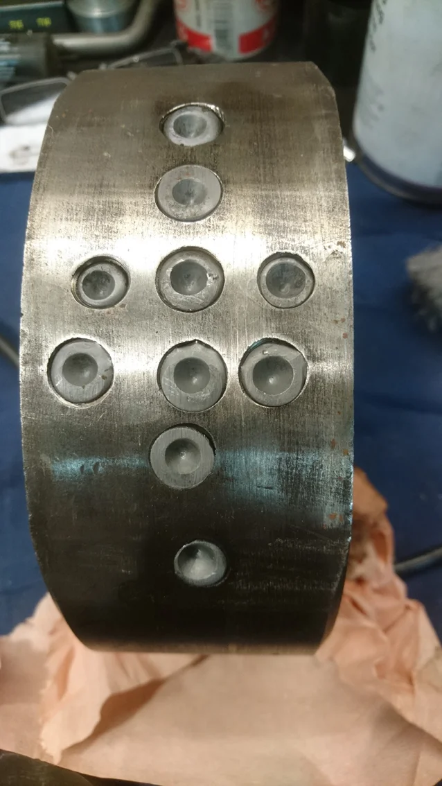 My -73 850 flywheel, holes everywhere but none deep enough to put a rod in. So it was back to the old "rod through the rods" method..... worked fine. Not sure, but it seems the holes in the wide side is filled up with something, lead? A bit strange since there are holes in the narrow part as well. I mean they could have skipped those and not having to fill in the other holes, I don´t get this.