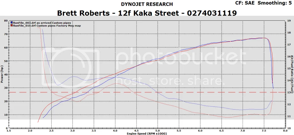 As you can see nothing much happening at the top end power wise, but the megaphone map is running richer (to rich). More power in the low to mid range. I'm just happy the idle is now pretty much as it should be. Clearly there is more power to come, but without the ability to remap the ECU it's not going to happen.