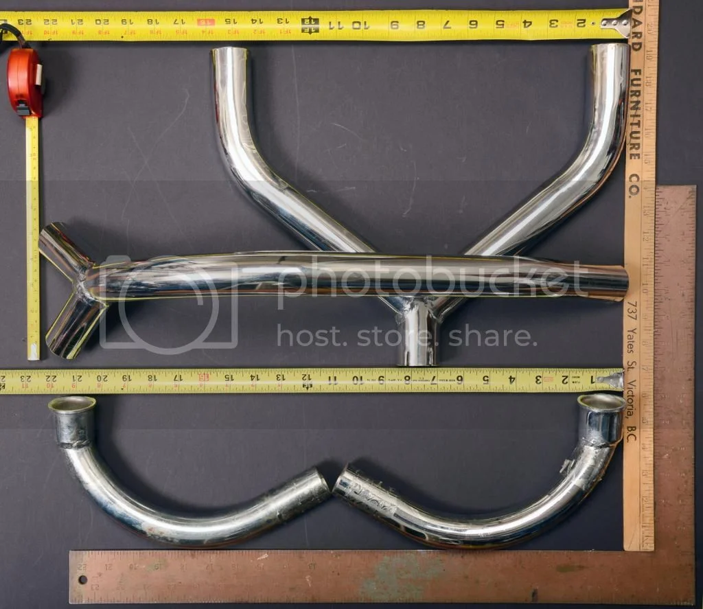 Other merits of the system were clearance in corners and a beautiful sound. In theory the centre tube acts as a collector pipe as used on most performance V8 type engines which continues to draw exhaust gases out after the end of the exhaust stroke preventing burned gases from re-entering the combustion chamber due to valve overlap on intake. The top pipes that are welded to the flange that fix to the head are 1 1/4" ID pipe. The mid section uses 1 3/8 ID pipe and the final Y section uses 1 1/2" ID pipe. When you do the math the wall thickness is 1/16" so each piece is a snug fit into the next.I ran one for quite a while with only one Dunstall exhaust fitted to one side with no noticeable change in performance. On another thread Comnoz reported having no noticeable advantage with the system on his race bike and opted for a custom tuned set for his particular engine. I ran these for years in the 70's and 80's and never had any problems with breakages or splitting welds. I learned to fit them by assembling them loosely and then grabbing the middle section underneath the bike and shaking vigorously while pushing upwards, then tighten the header nuts, top pieces, mid section and finally the exhaust pipes in that order and using everything you've got to keep the upward pressure on the whole time. I never raced but did lots of 2, 3 and 400 mile road trips with zero issues. The biggest drawback for me was the low ground clearance which I learned to work around. Most used sets you see are dented on the bottom piece. I never used a center stand so that was a non issue and I didn't miss it.