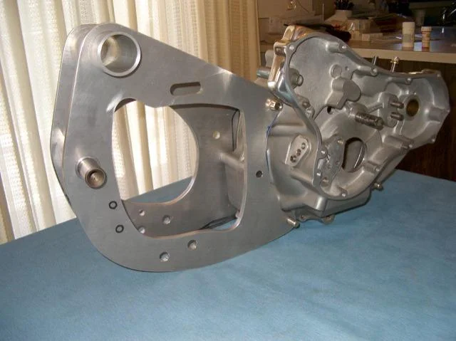 modified cutout for easier gearbox removal , fixed gearbox , spindle secured at 3 points instead of one , higher location for swingarm to go with shorter rear suspension , extentions for exhaust supports ,etc...: