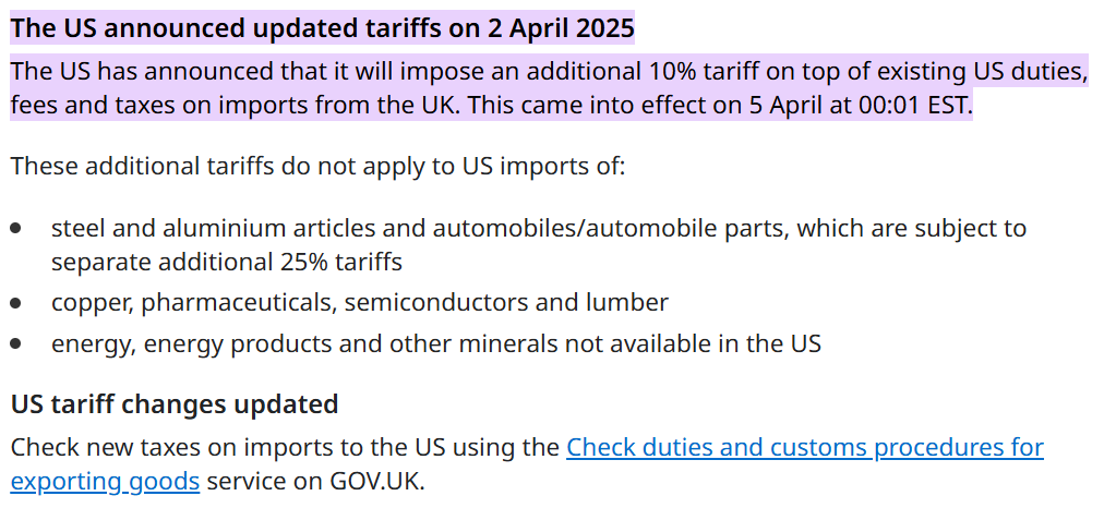 Considering that I average three orders/month from the UK and I watch it all very carefully, I can assure you that is on the goods, not the total. Also, what you posted is VERY old. The August 29th changes are the ones in effect. In effect, the tariff is 25% from the UK as orders have at least some copper, steel, and/or aluminum. From other countries, if copper is involved, most are 50%.