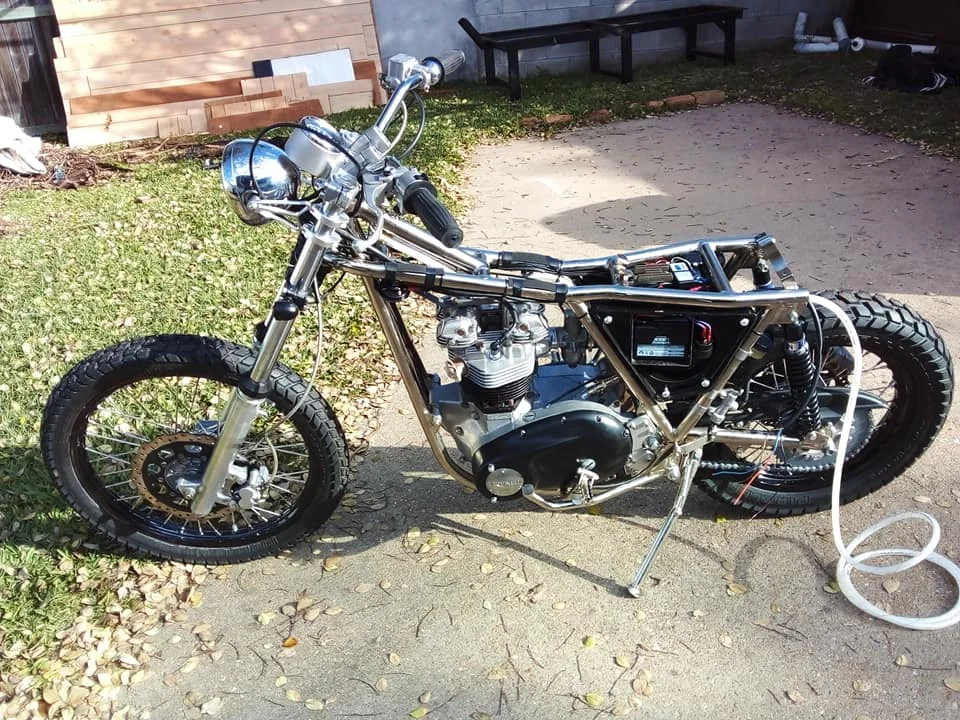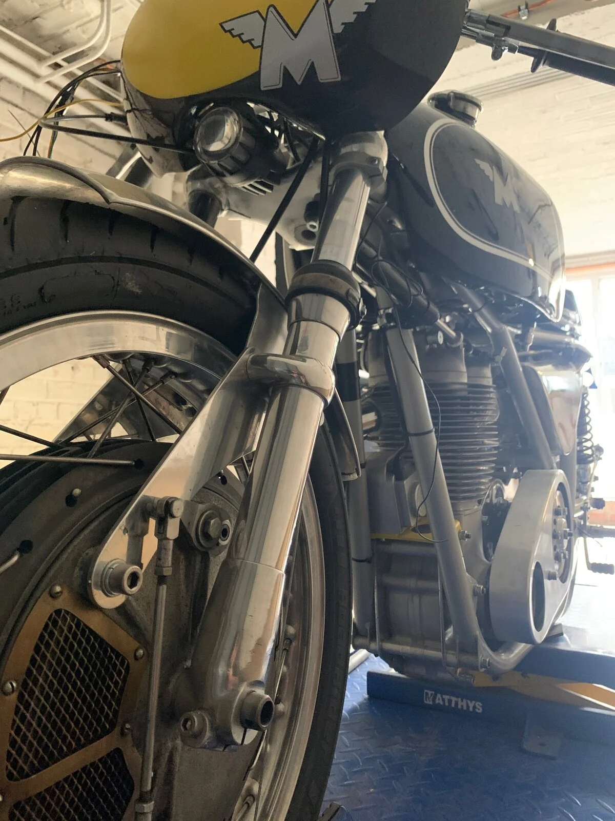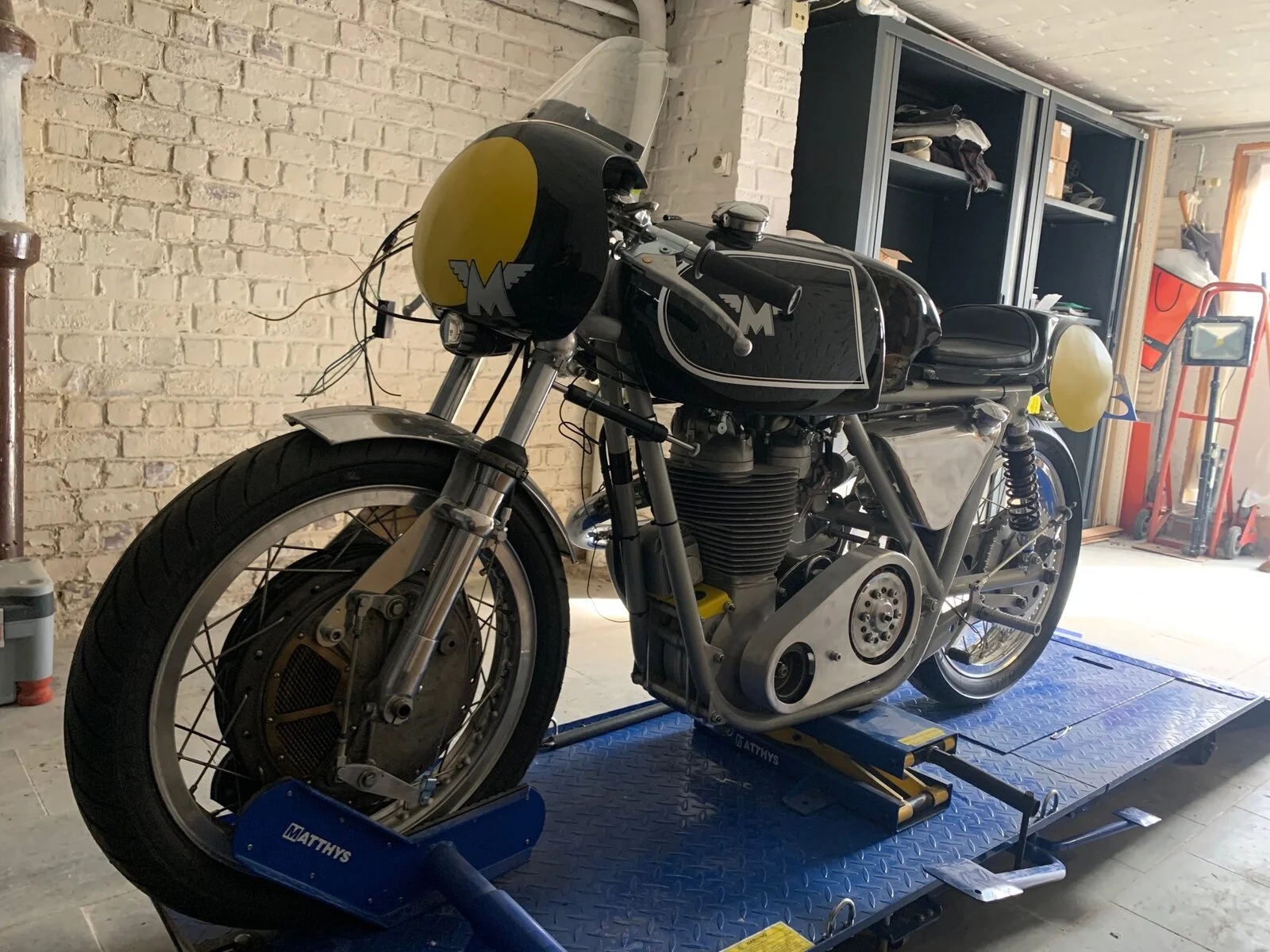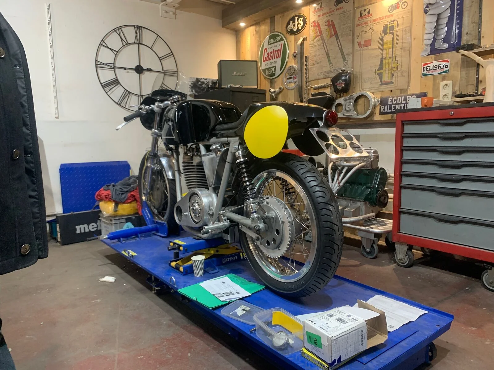 I noticed that my carburetion is a bit too rich and that the E speedo is not yet right, but I postponed this work until later, I brought in Fabien's bike: A matchless 500 in a rickman frame, the engine has been tuned in england by a specialist, but it has not yet run.