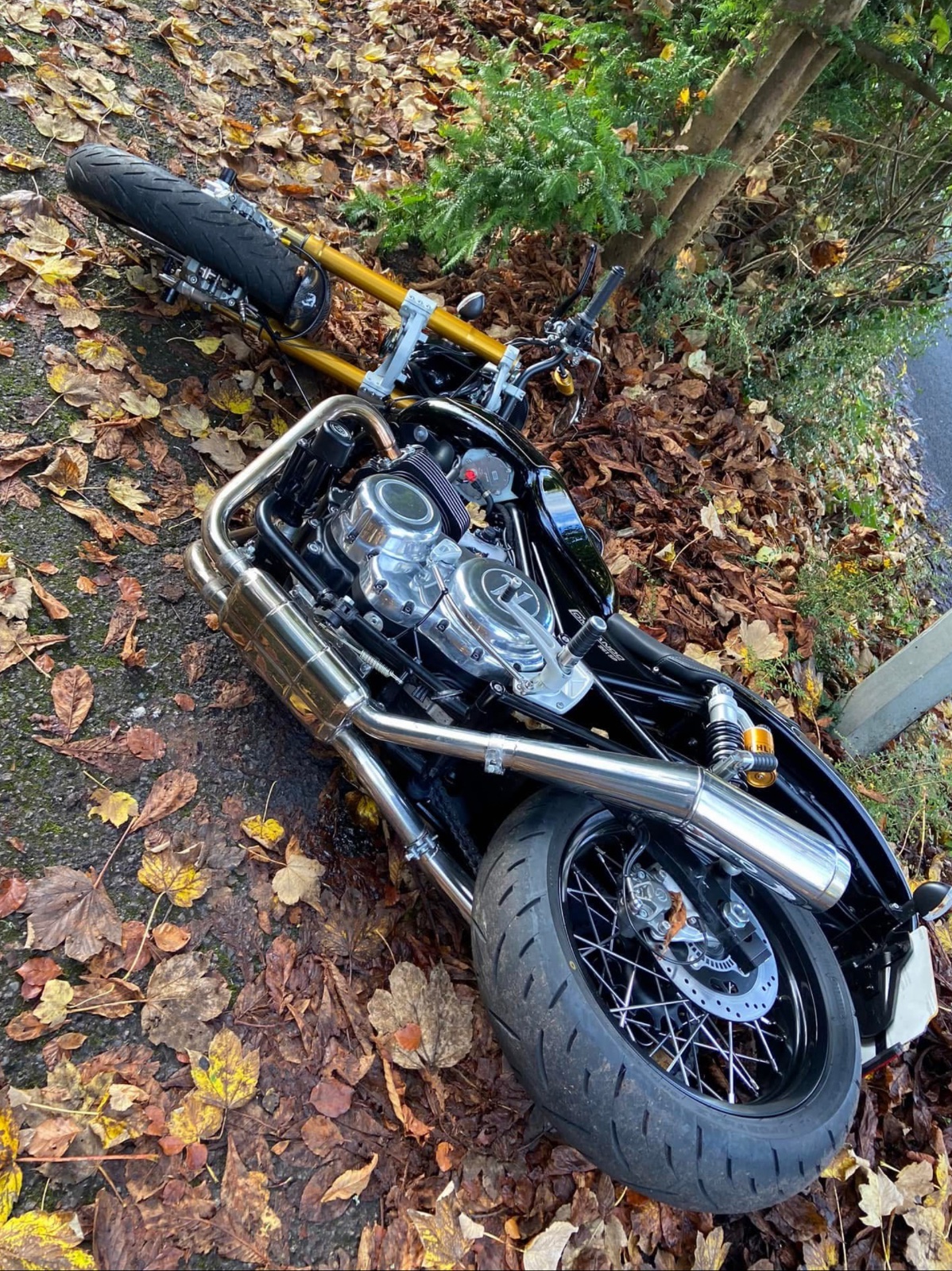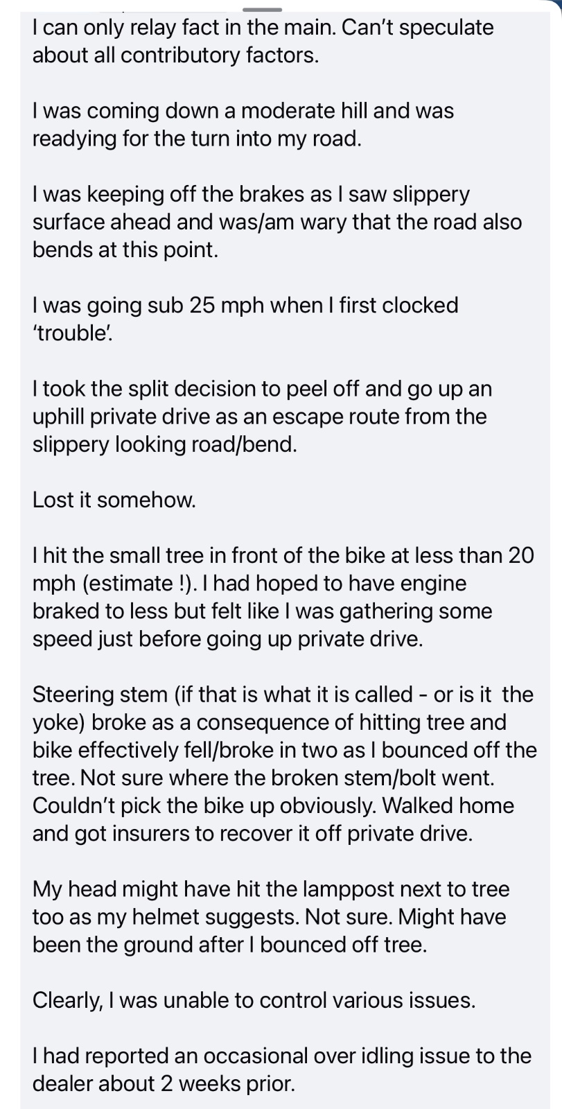 Small tree - big impact. If it is a straight accident, I’m guessing at speed, highside (or bike flipped) maybe to come down hard enough to shear the steering stem. If there’s a critical failure involved (unlikely I think) hopefully the details will come out pretty quickly. Apparently Norton is aware of the incident though, so who knows.