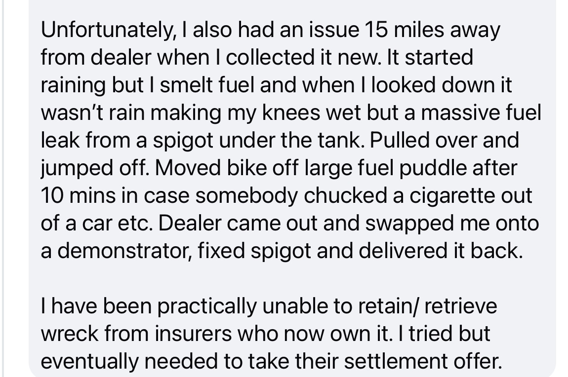 There are definitely a few unanswered questions Jan - doubt we’ll ever get the full story. Apparently the incident happened a couple of weeks ago; the bike is with the insurer.