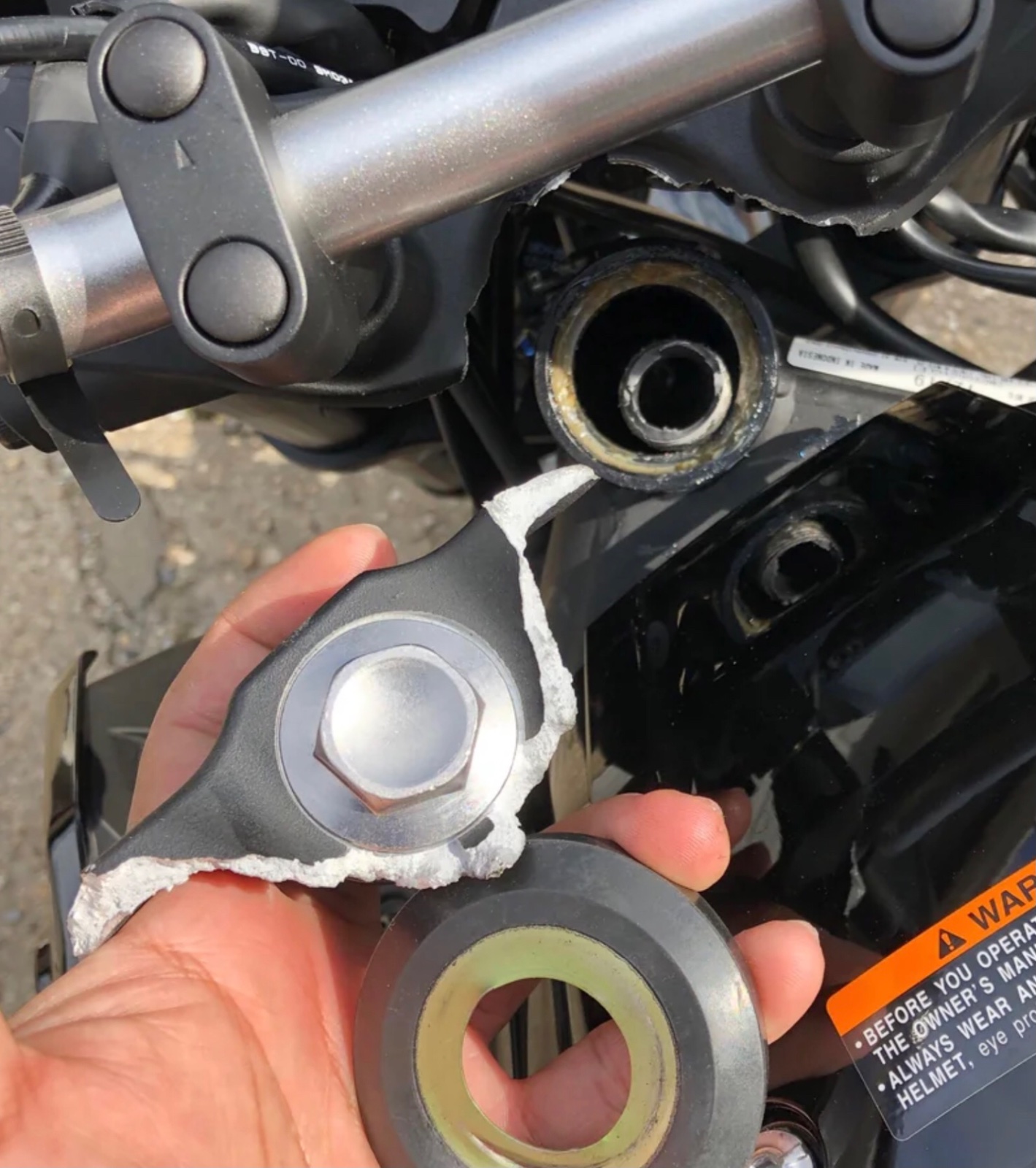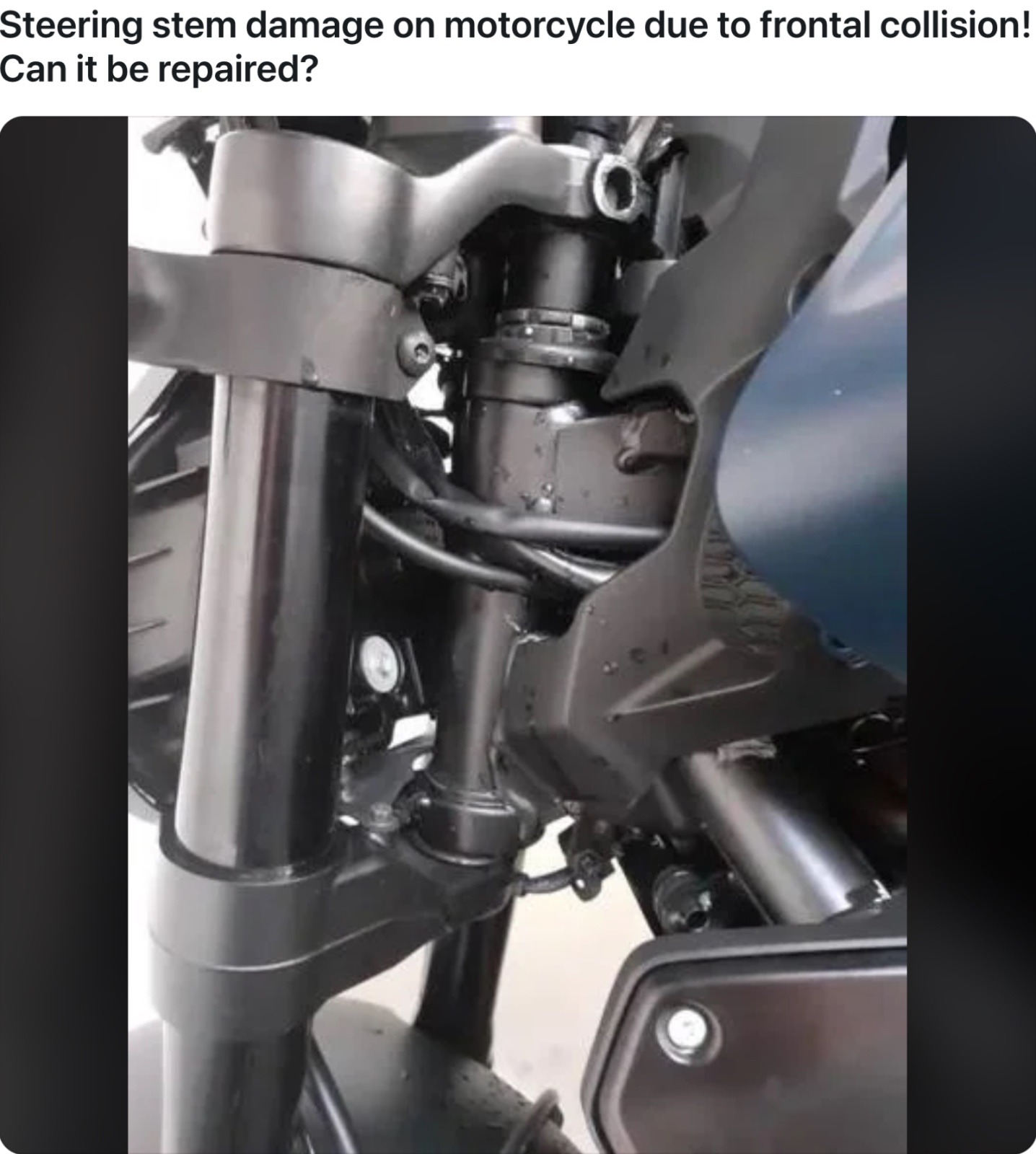 Looking at the images though, it appears the impact has sheared the steering stem top (and bottom?) away from the headstock. As a result the entire front end has seperated. Pretty unusual outcome, but I guess possible. One of the FB guys noted a very similar outcome from a friend’s crash.