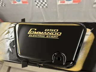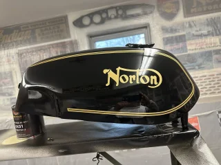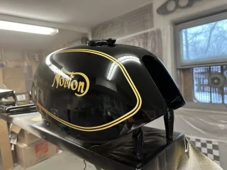 I started an earlier thread about the saga with getting a good quality metal fastback tank. You all saw the before shots. Well, here are the shots from the painter…couldn’t be happier. I know the name Brent Budgore and The Vintage Vendor is familiar to so many Norton folks in this site, but I can’t stress what a great guy he is. Very thorough and thoughtful. I wanted the stripes and decals for this bike to be a nod to the Commando striping, but still flow and make sense for the Fastback body work. He nailed it. I think this is bike number 7 or 8 he’s done for me over the last several years. I’d love to hear your comments!