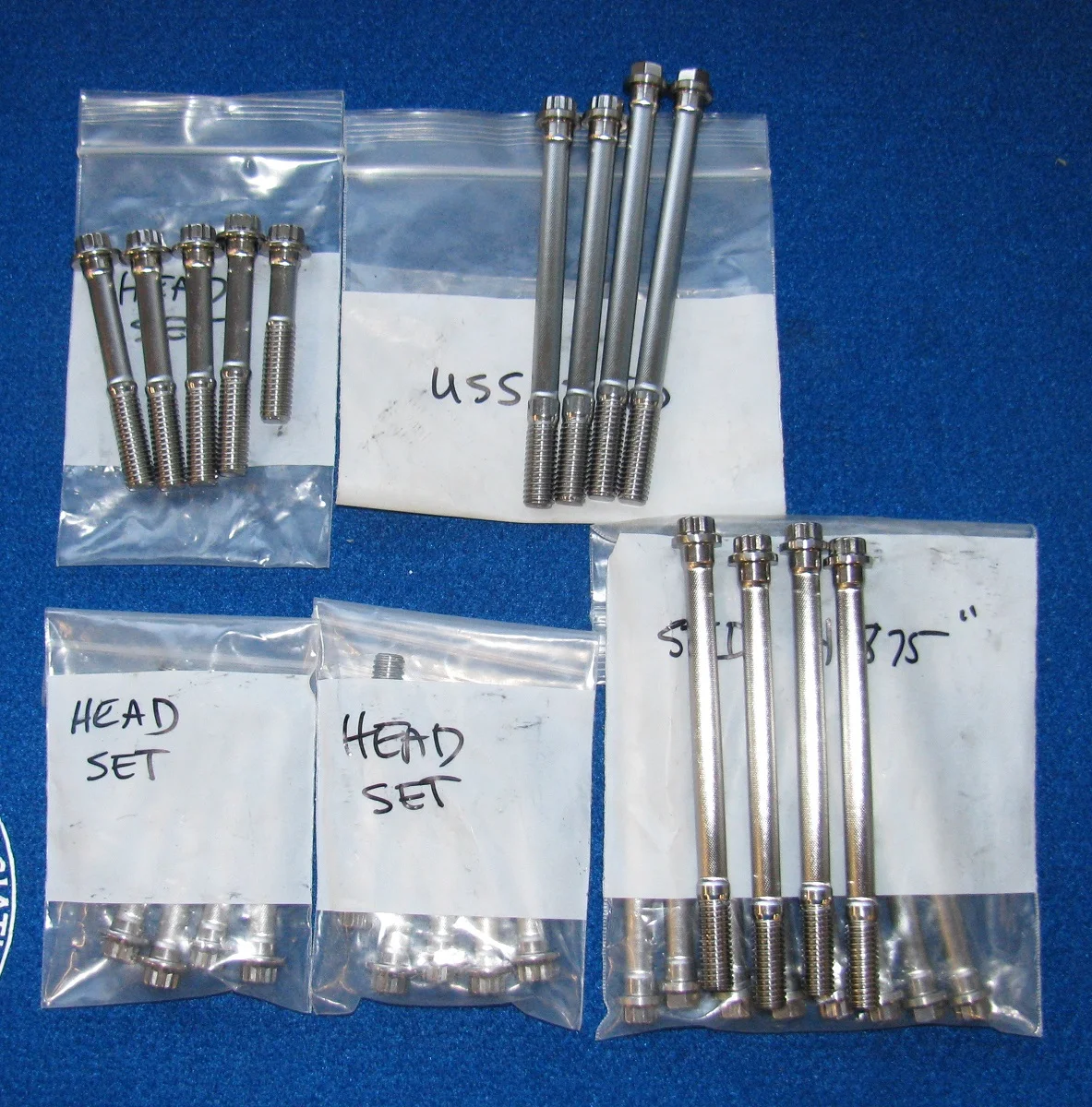 Just got these back from comnoz, who did his trick machining to reduce the shank diameter. They are ARP high strength stainless bolts. The head bolts are unmodified except for Jim's treatment. The cylinder through bolts have also had the head flange turned down to fit the counterbores in the cylinder, and are shortened to the proper length. The standard through bolts are the stock length, but the ones for the 75 mm short stroke are two different lengths, because one pair of them sits on top of the cylinder instead of in a counterbore, and they are also a different length to fit the shortened cylinders that allow stock length rods. Pretty, pretty.