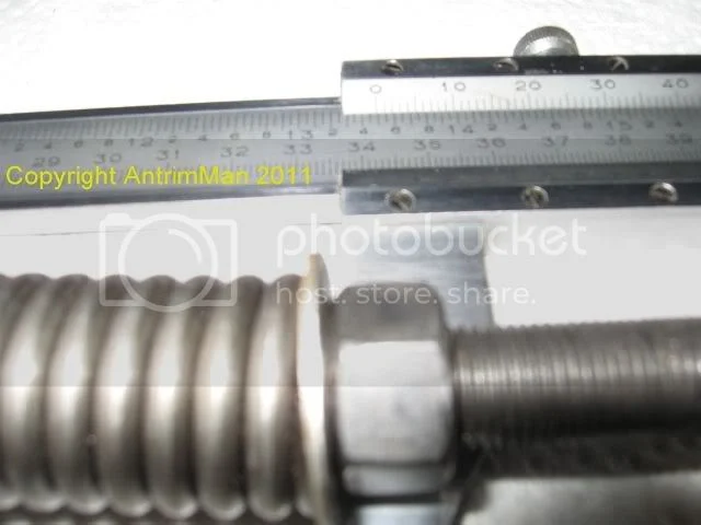 Here is the complete spring/damper assembly, the length of the Commando stanchion is represented by the white plastic strip, cut to: 23.161" which is the Commando stanchion length according to the NOC website info, (I do not have a spare so I cannot verify the length, according to the Norvil parts list it's 23.250" and from a previous post, one of our members found them to be as long as 595mm, 23.425"),. The spring measured: 18.575" free, 13.25" coil-bound, giving 5.325" of free movement. When fitted to the damper assembly the spring is compressed approximately .475" thus leaving 4.85" of free movement.