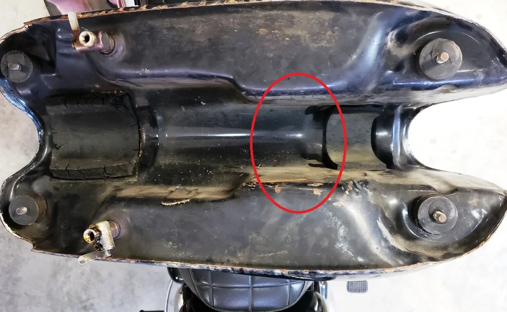 Another data point. I have another brand new, beautifully hand pinstriped and painted in 850 style black Roadster tank that I got as a part of a large lot of parts. I have no idea who made it, but it is not baffled and the underside is very different from OEM. It's studs are 5-3/8" center-to-center. The steel is lighter than the current EMGO tanks - I'm guessing India but the quality is better than their usual stuff.