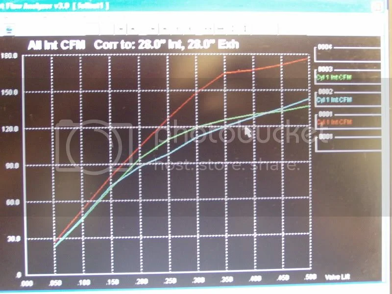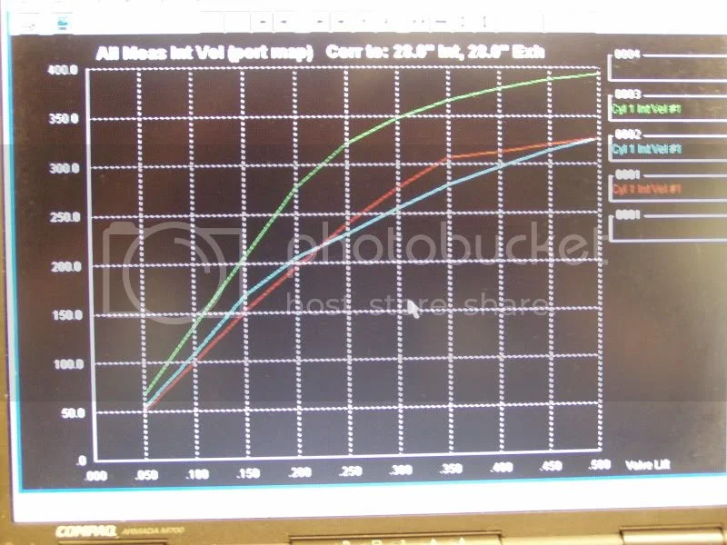 I've been using a manometer with plastic hose in the port to get an idea of velocity. Hope I am doing it right. Vizard has a chart reading up to 38"w which equals around 400fps. That approximates speed if the bench is testing at 28"w... in theory. Depending where I put the hose end I can get 34" 380fps just in the manifold, 40" 420fps in the port and down near the guide 52" probably 450fps? But that's beyond his graph. It varies depending where it is, it seems fast on the short turn, not that I can see it so well and the hose in there probably affects it.So now that I identified a problem with my prior velocity readings and corrected them -here is the flow tests with the 1.5mm oversize intake and a little work in the valve guide and bowl area.