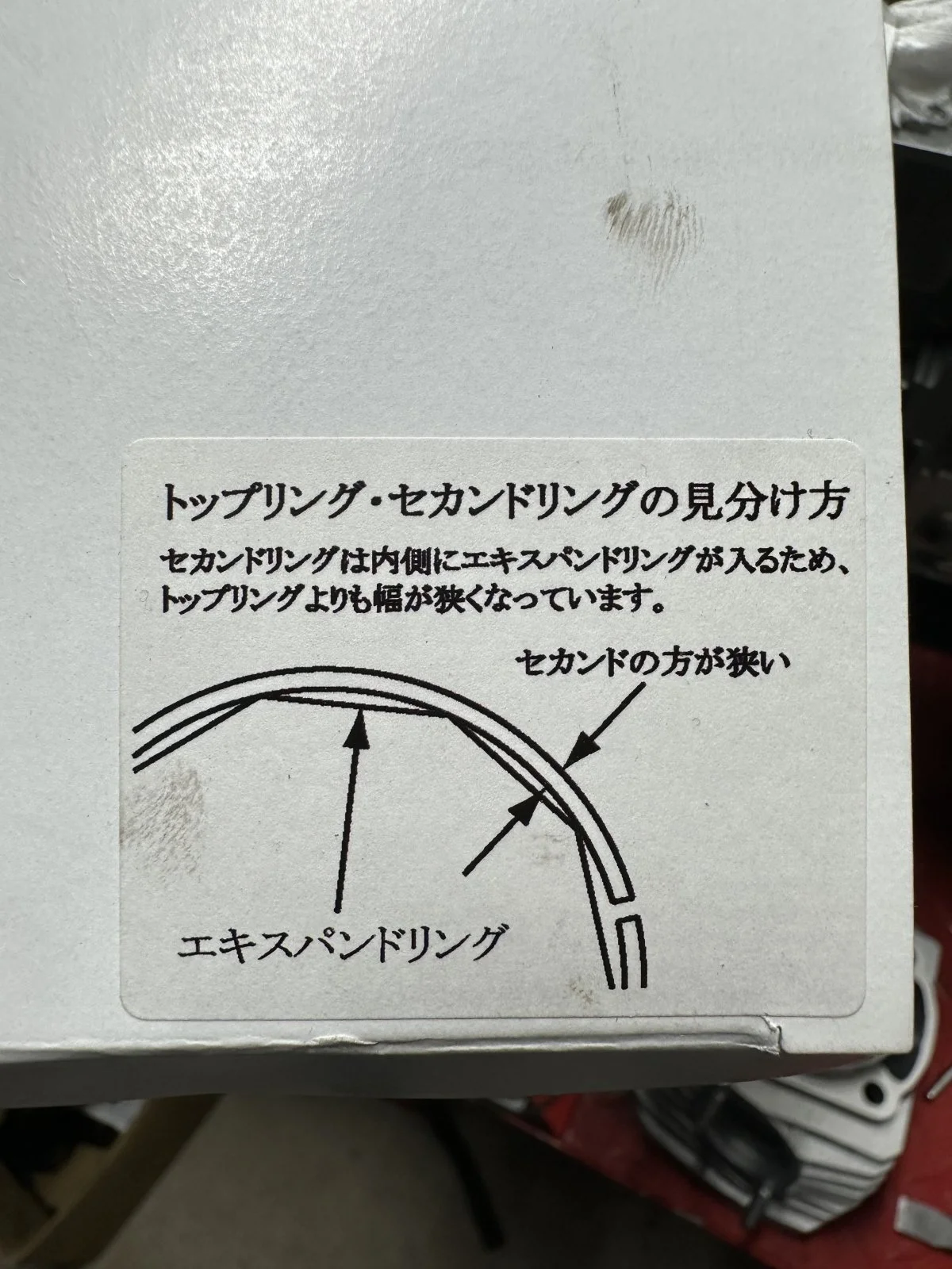 Okay..... So a Japanese co-worker here at the hangar helped me with the translation .... but he used an App on his phone to do the translation, I believe it's because he's not a mechanic, or familiar with the Japanese used (many folks are like that here, not familiar with descriptive wording of things). Anyway, here it goes: Discrimination of the Top Ring Second ring. The second ring has an expanded ring inside, It is narrower than the top ring. the second is narrower MAA Expanding. Cj