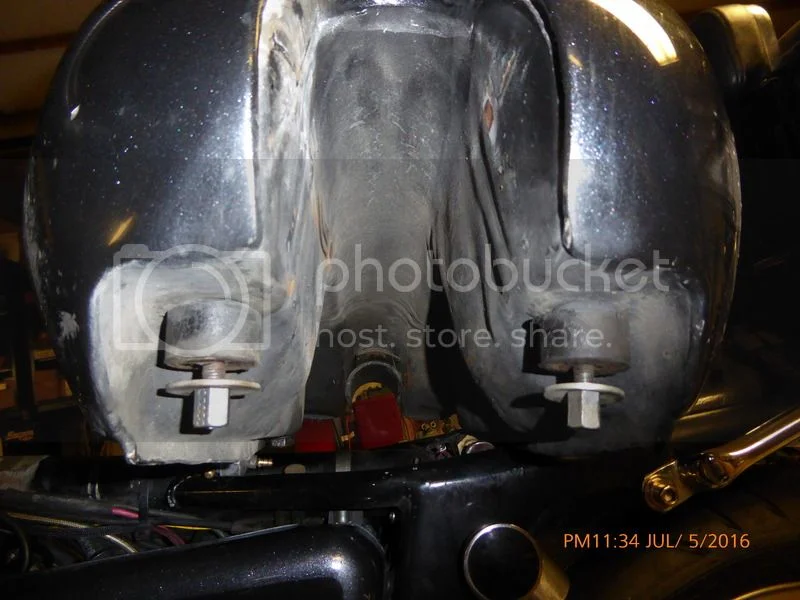 The problem with the stud is that if there is any misalignment between the stud and the frame mount it will put side pressure on the stud and then onto the tank insert, the exhaust mount eliminates this, I changed to them as soon as I saw them posted here as a mod, wish I had done it before as it would have saved a repair to my Interstate tank when the stud insert started to leak.