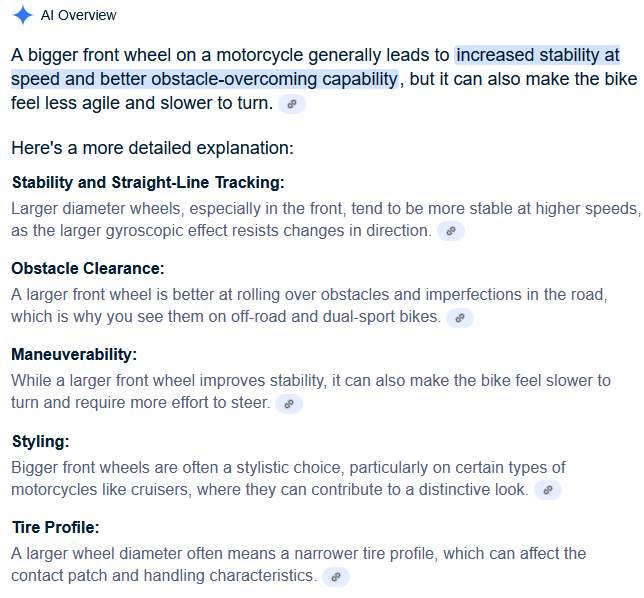 Wrong as usual... Here's what the Ai generated answer says about bigger front wheels.Tyre size affects the trail. The bigger front wheel should make the bike more nimble, and when combined with the smaller rear wheel, the centre point between understeer and oversteer when the bike is gassed should be more towards oversteer - With slightly more trail, you might not have to countersteer so much when tipping into corners. On most motorcycles, when you accelerate and the rear goes down, they tend to stop running wide. It is the reason it is usually better to accelerate when in corners. With less trail, the bike usually tends to take on more lean, so you tend to ride slower. You cannot use a lot of power at high angles of lean, unless you have super tyres. If the bike stays more upright and oversteers in corners when you gas it, you can really give it the berries, even when you have shit tyres. Do everything slowly until you get faster.