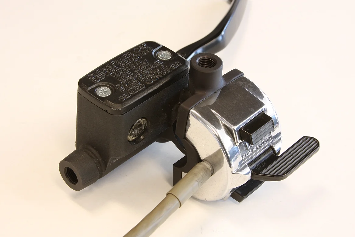 The master cylinder is supplied as a ‘short’ kit, i.e. less the brake lever, pivot bolt, reservoir diaphragm and cap or as a ‘full’ kit including all these parts. The body has a threaded boss to accept an original style mirror.