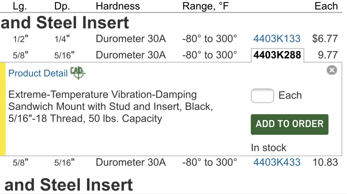 Good call! As noted back on page 3, I used McMaster-Carr's 60A durometer, and am now thinking 50A would have been better. Let us know if you notice any change in isolastic action, as mine seems to transmit more vibration at low rpms, and the "smooth point" moved up from around 2500 to 2800 rpm. 'Very curious to hear about yours.acadian said:Picked up the set of isolastics ordered locally from ackland-grainger. 50 durometer, not sure what the originals are, but these are noticeably denser.